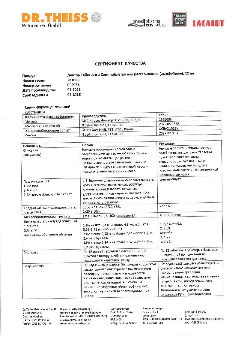 Неактивные ингредиенты: сахароза 1443,0 мг, глюкозы сироп 962,0 мг, шалфейный ароматизатор 7,0 мг, лимонная кислота 7,4 мг, карамель Е 150с 7,0 мг, эвкалиптовое масло 1,0 мг, вода 63,0 мг.
