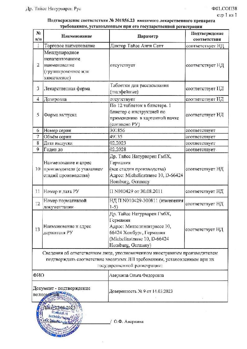 При планировании беременности, наступлении беременности и кормлении грудью перед приемом лекарственного препарата Доктор Тайсс Анги Септ проконсультируйтесь со специалистом. Безопасность при беременности и кормлении грудью не установлена.