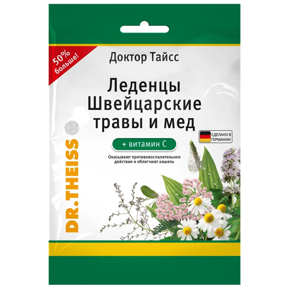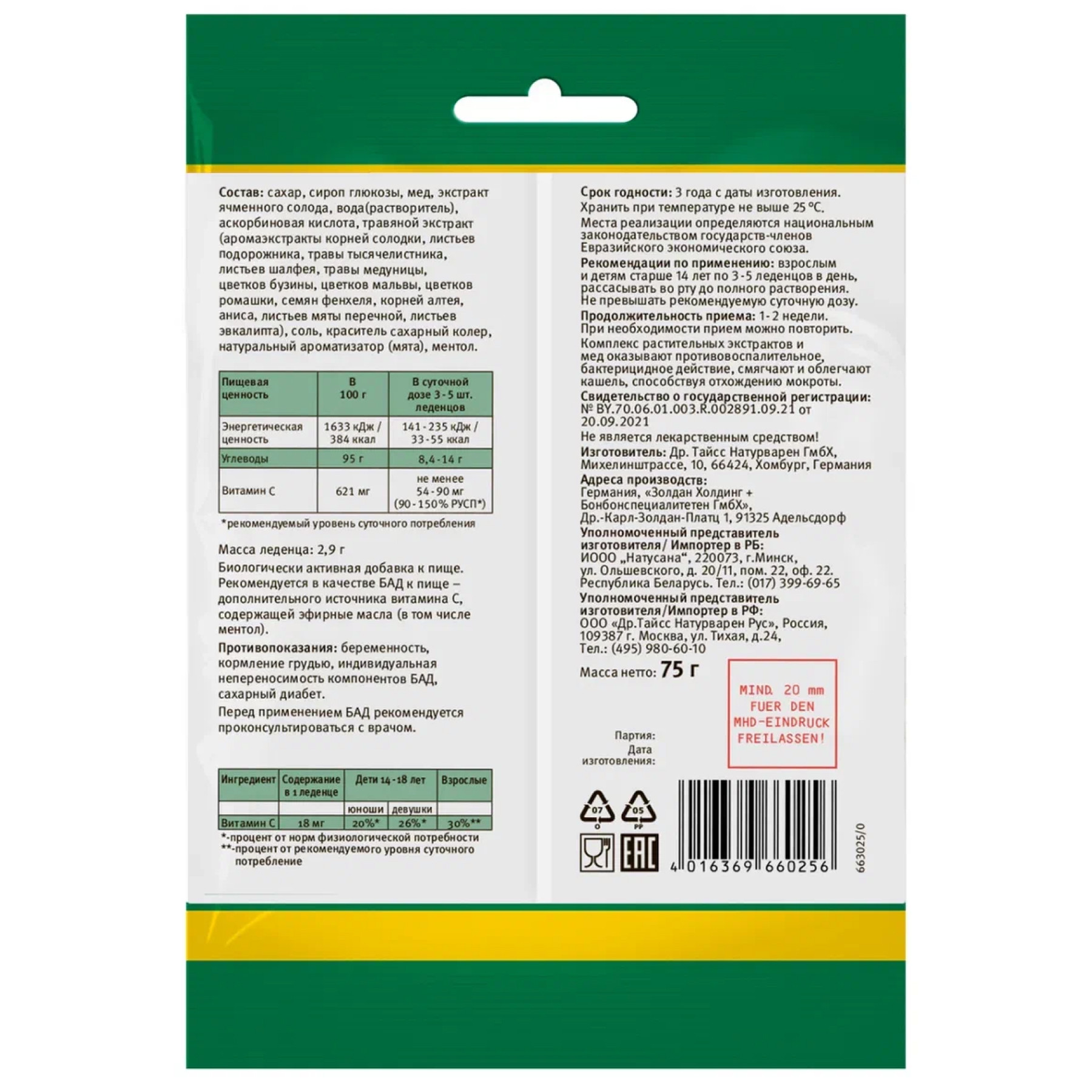 Сахар, сироп глюкозы, мед, экстракт ячменного солода, вода(растворитель), аскорбиновая кислота, травяной экстракт (аромаэкстракты корней солодки, листьев подорожника, травы тысячелистника, листьев шалфея, травы медуницы, цветков бузины, цветков мальвы, цветков ромашки, семян фенхеля, корней алтея, аниса, листьев мяты перечной, листьев эвкалипта), соль, краситель сахарный колер, натуральный ароматизатор (мята), ментол.