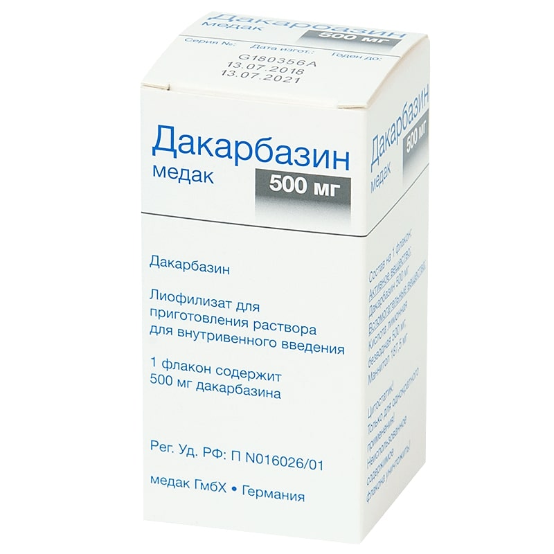 Активное вещество: Дакарбазин 500 мг.