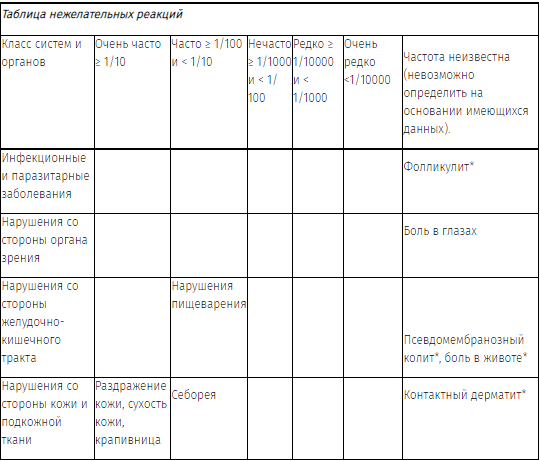 При местном применении клиндамицин может всасываться в количествах, вызывающих системные эффекты. К возможным системным побочным эффектам можно отнести диарею, геморрагическую диарею, включая псевдомембранозный колит.