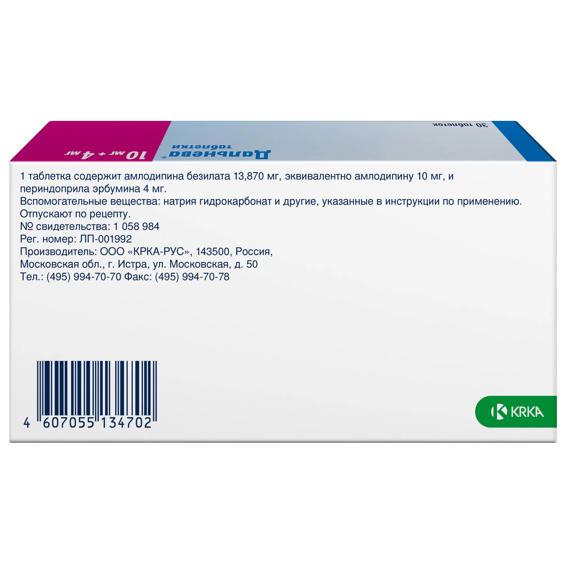 Активные вещества: амлодипин 10 мг, периндоприл 4 мг.