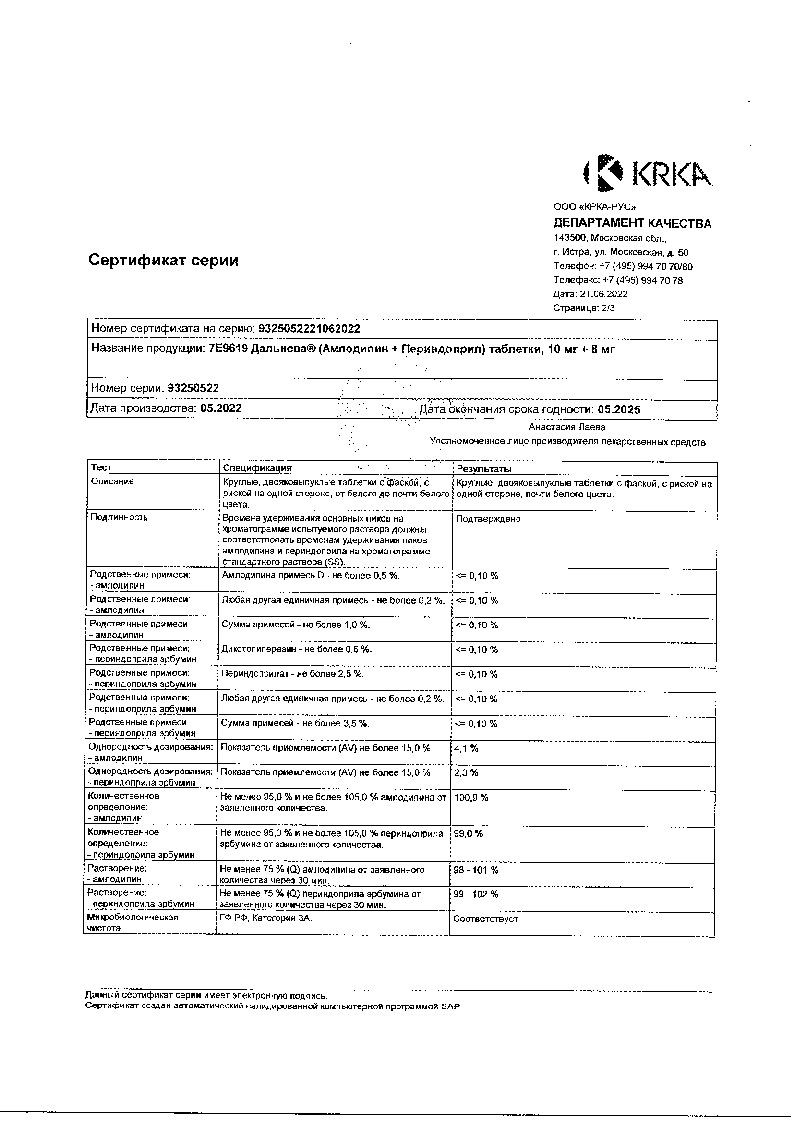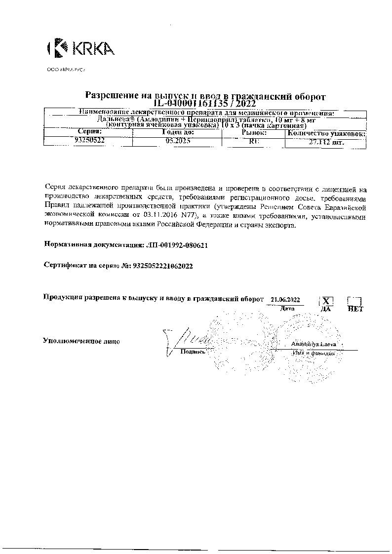 Симвастатин: при одновременном применении нескольких доз амлодипина по 10 мг и симвастатина 80 мг было отмечено увеличение экспозиции симвастатина на 77 % по сравнению с изолированным приемом симвастатина. У пациентов, принимающих препарат Дальнева® в дозировке амлодипин 10 мг + периндоприл 4 мг или амлодипин 10 мг + периндоприл 8 мг, следует ограничить прием симвастатина до 20 мг в сутки.