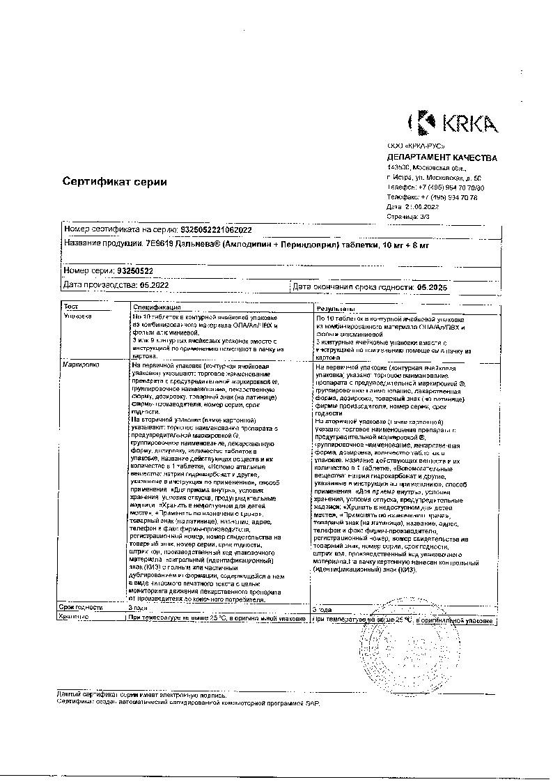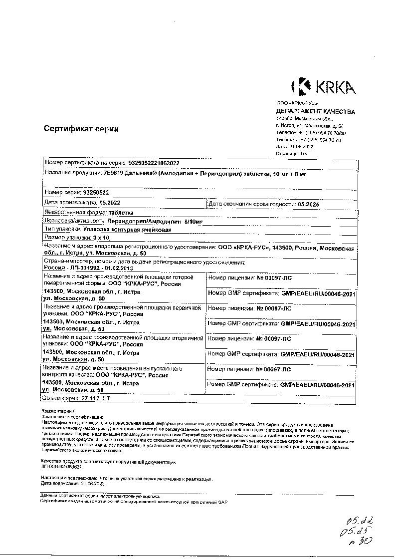 Симвастатин: при одновременном применении нескольких доз амлодипина по 10 мг и симвастатина 80 мг было отмечено увеличение экспозиции симвастатина на 77 % по сравнению с изолированным приемом симвастатина. У пациентов, принимающих препарат Дальнева® в дозировке амлодипин 10 мг + периндоприл 4 мг или амлодипин 10 мг + периндоприл 8 мг, следует ограничить прием симвастатина до 20 мг в сутки.