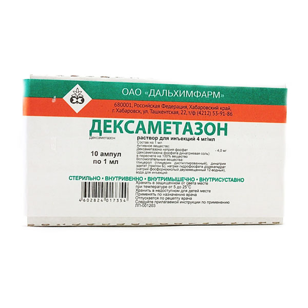 Активное вещество: дексаметазона натрия фосфат (дексаметазона фосфата динатриевая соль) в пересчете на 100% вещество 4,0 мг;
