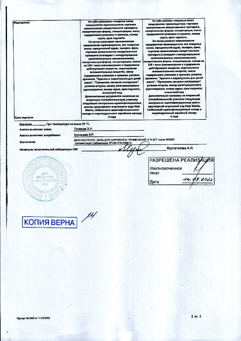 При местном применении декспантенол быстро абсорбируется кожей и превращается в пантотеновую кислоту, связывается с белками плазмы (главным образом с бета-глобулином и альбумином). Концентрация ее в крови 0,5-1 мг/л, в сыворотке крови - 100 мкг/л. Пантотеновая кислота не подвергается в организме метаболизму (кроме включения в ко-фермент А), выводится в неизмененном виде почками.