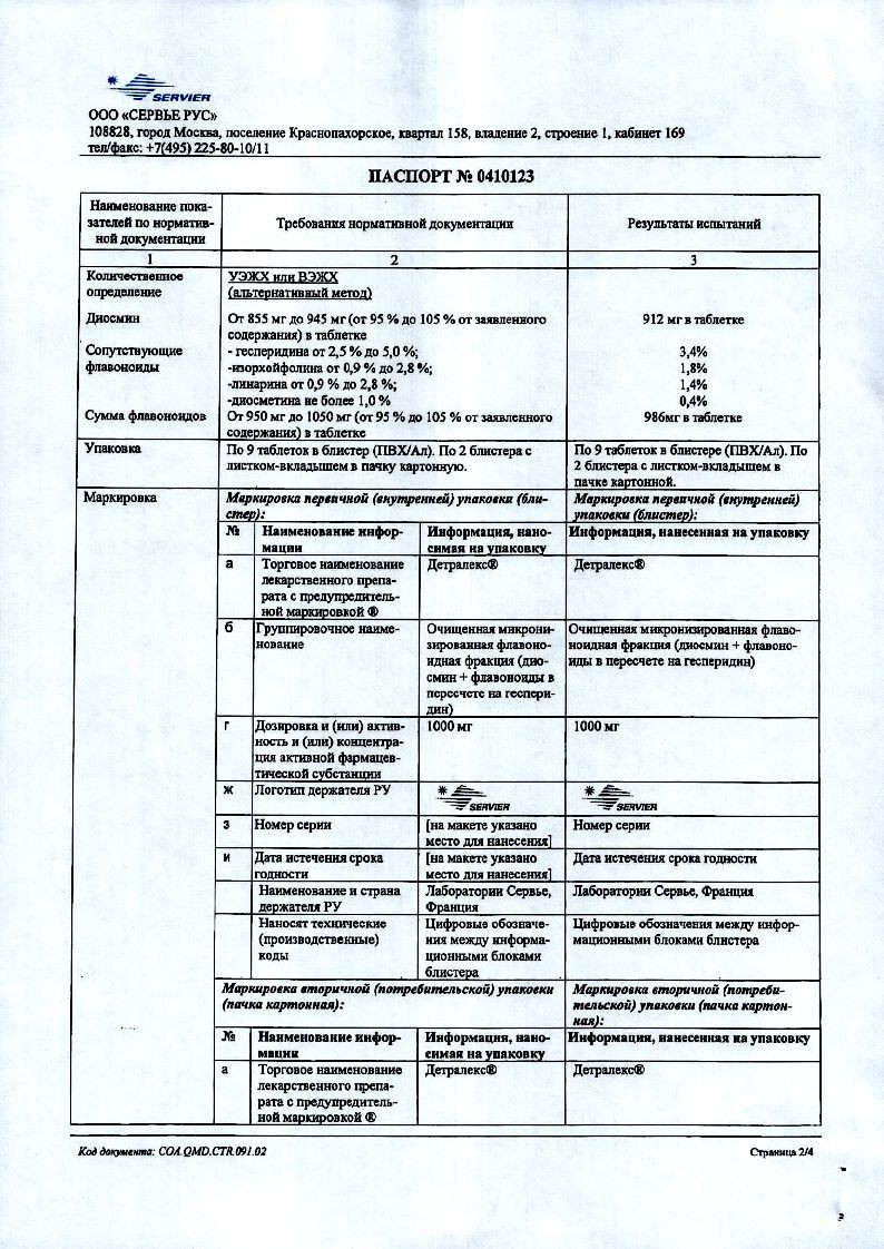 Препарат повышает венозный тонус: с помощью венозной окклюзионной плетизмографии было показано уменьшение времени венозного опорожнения. У пациентов с признаками выраженного нарушения микроциркуляции, после терапии таблетками Детралекс® отмечается (статистически достоверное по сравнению с плацебо) повышение капиллярной резистентности, оцененной методом ангиостереометрии.