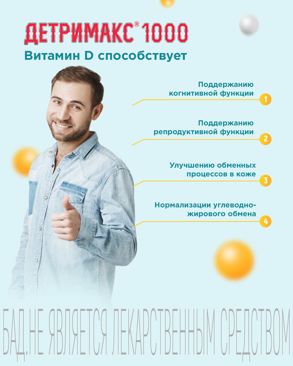 Детримакс® Витамин Д3 содержит витамин D3 (колекальциферол) - жизненно важный жирорастворимый витамин, необходимый для обеспечения деятельности практически всех органов и систем человеческого организма. Хорошо усваивается в ЖКТ за счет образования в среде тонкого кишечника мицеллярных соединений.