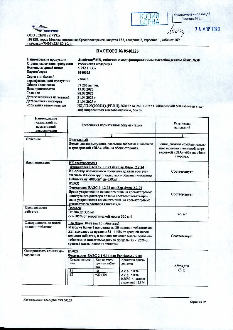 1 таблетка лекарственного препарата Диабетон® МВ, таблетки с модифицированным высвобождением 60 мг, эквивалентна 2 таблеткам лекарственного препарата Диабетон® МВ, таблетки с модифицированным высвобождением 30 мг. Наличие насечки на таблетках 60 мг позволяет делить таблетку и принимать суточную дозу как 30 мг (*/2 таблетки 60 мг), так и при необходимости 90 мг (1 и ’/г таблетки 60 мг).