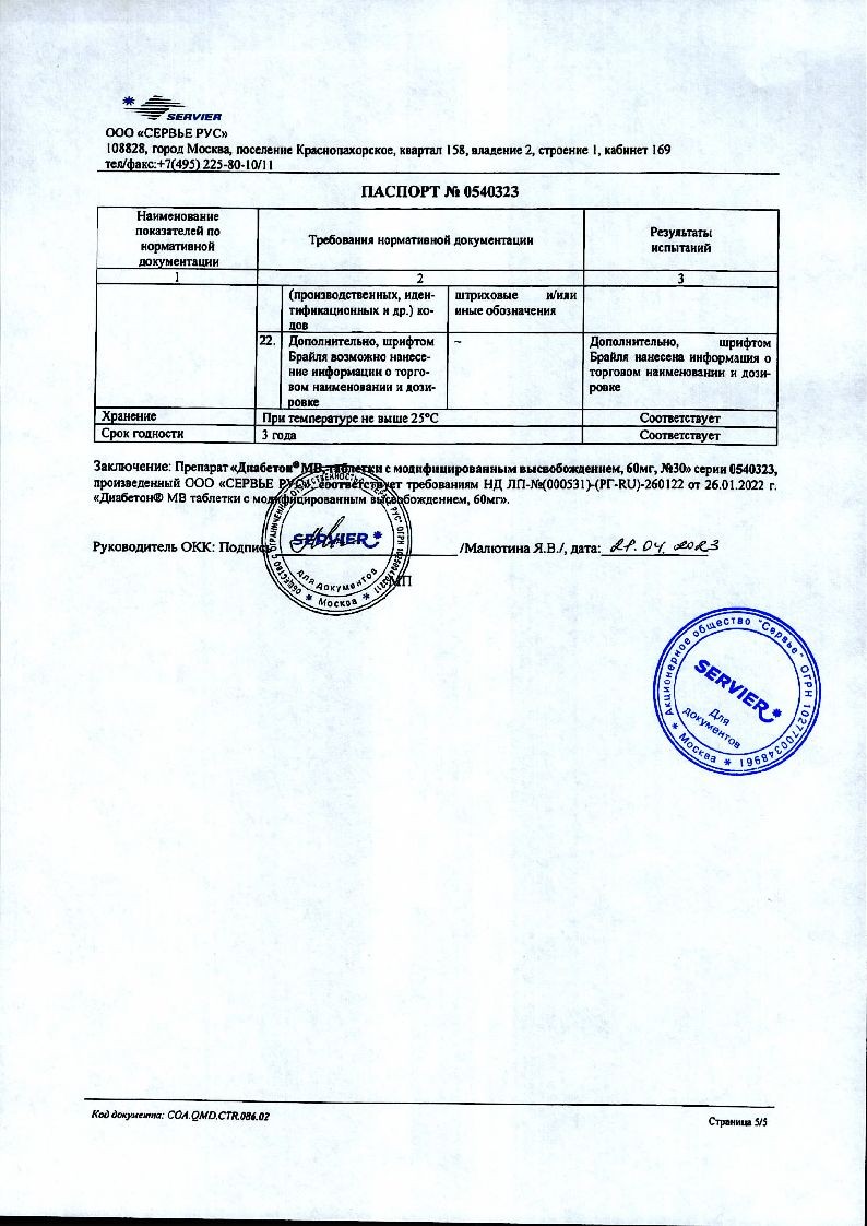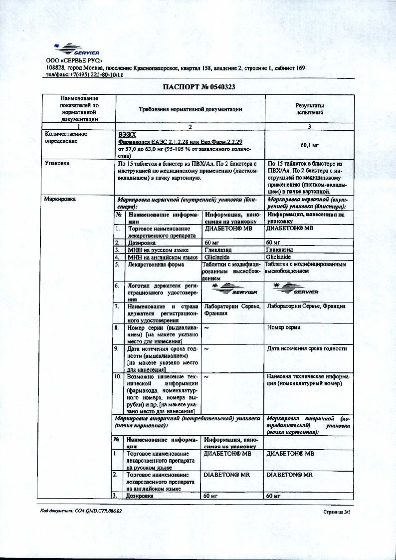 1 таблетка лекарственного препарата Диабетон® МВ, таблетки с модифицированным высвобождением 60 мг, эквивалентна 2 таблеткам лекарственного препарата Диабетон® МВ, таблетки с модифицированным высвобождением 30 мг. Наличие насечки на таблетках 60 мг позволяет делить таблетку и принимать суточную дозу как 30 мг (*/2 таблетки 60 мг), так и при необходимости 90 мг (1 и ’/г таблетки 60 мг).