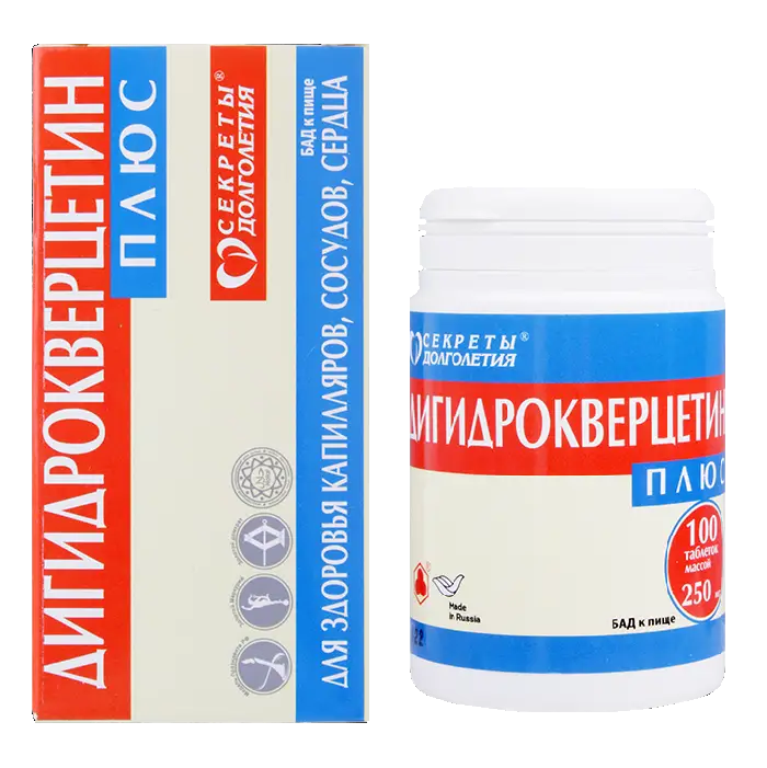 Активные вещества: дигидрокверцетин – 25 мг, витамин С – 10 мг, витамин Е – 4 мг,