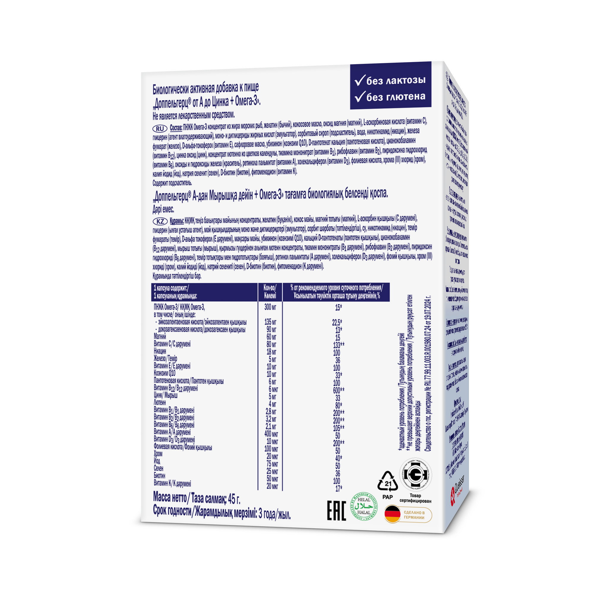 Комплекс «Доппельгерц® от А до Цинка + Омега-3» - практичное решение для тех, кто хочет получить наиболее полный комплекс витаминов, минеральных веществ и омега-3 жирных кислот в одной капсу-ле. Продукт содержит 500 мг высокоочищенного концентрата жира морских рыб с высоким содержани-ем омега-3 жирных кислот.