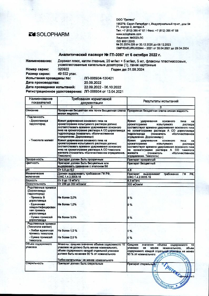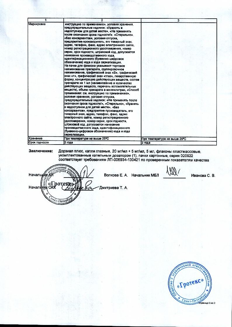 После вскрытия флакона препарат можно применять в течение всего срока годности. По истечении этого срока препарат следует уничтожить. При видимых повреждениях флакона применять препарат Дорзиал плюс не следует.