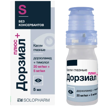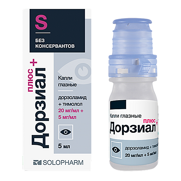 Препарат содержит два активных компонента: дорзоламида гидрохлорид и тимолола малеат, каждый из которых уменьшает повышенное внутриглазное давление за счет снижения секреции внутриглазной жидкости. Совместное действие этих веществ в составе комбинированного препарата Дорзиал плюс приводит к более выраженному снижению внутриглазного давления.