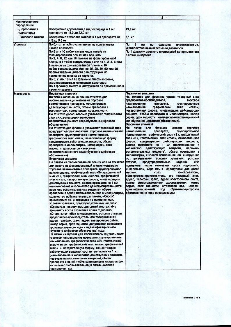 дорзоламида гидрохлорид 22.26 мг, что соответствует содержанию дорзоламида 20 мг, тимолола малеат 6.83 мг, что соответствует содержанию тимолола 5 мг.