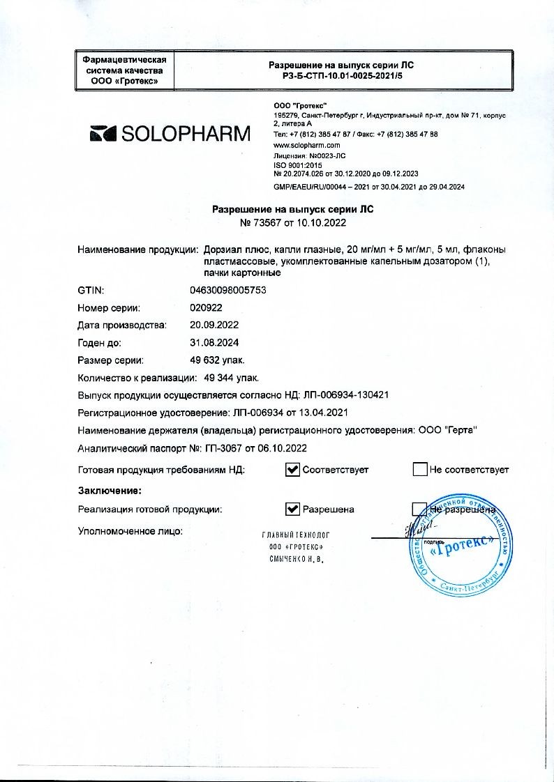 После вскрытия флакона препарат можно применять в течение всего срока годности. По истечении этого срока препарат следует уничтожить. При видимых повреждениях флакона применять препарат Дорзиал плюс не следует.