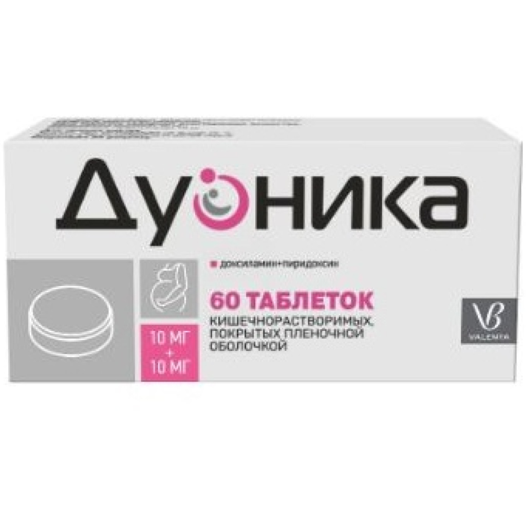 Препарат Дуоника® является комбинированным препаратом, содержащим два действующих вещества: доксиламин (в виде сукцината) и пиридоксин (в виде гидрохлорида).