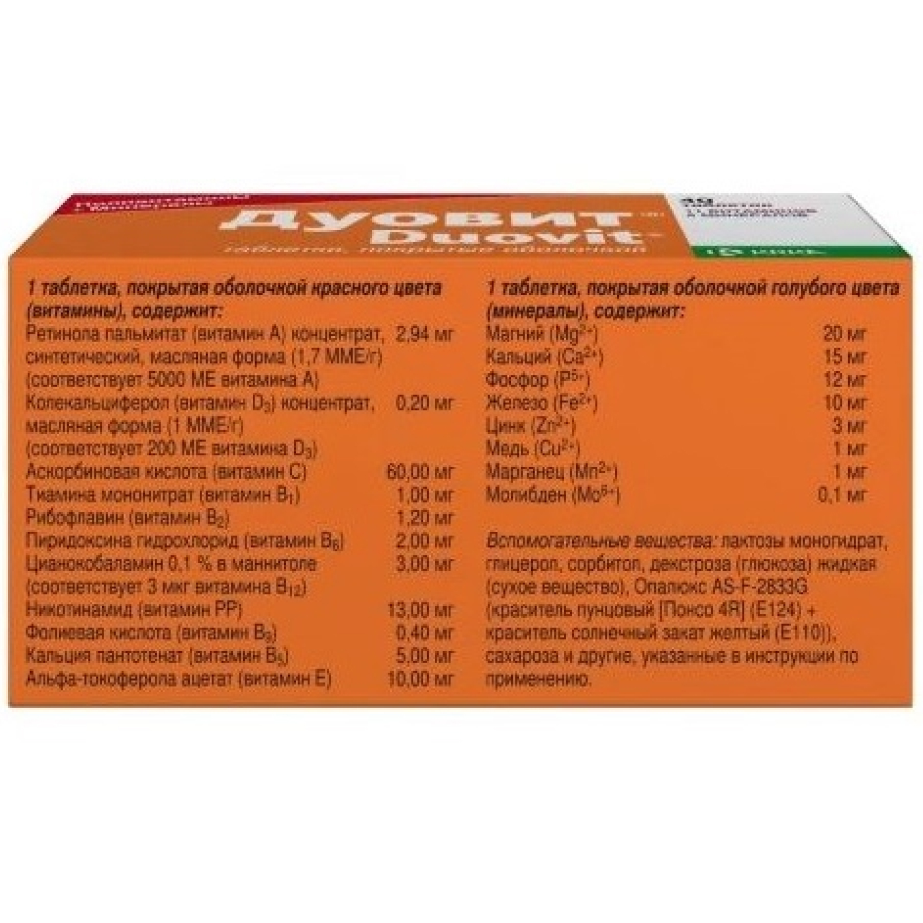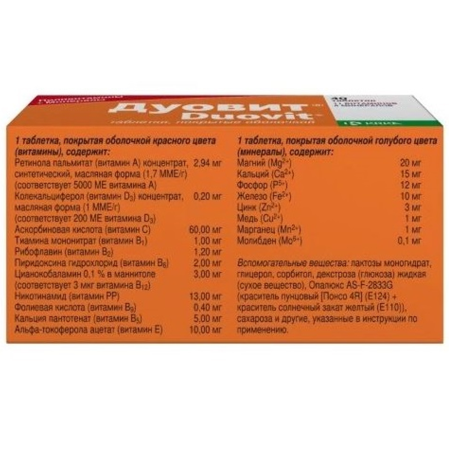 1 таблетка, покрытая оболочкой красного цвета (витамины), содержит: