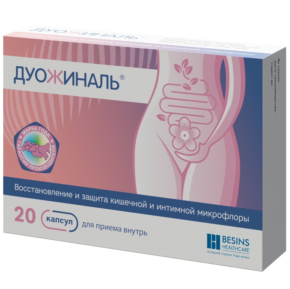 Дуожиналь® содержит комбинацию двух полезных лактобактерий Lactobacillus rhamnosus HN001 и Lactobacillus acidophilus La-14 для восстановления и поддержания нормальной микрофлоры влагалища и кишечника. Лактобактерии являются частью естественной желудочно-кишечной микробиоты и вагинальной среды и при пероральном применении помогают в нормализации микрофлоры влагалища, способствуя защите от инфекционных заболеваний мочеполового тракта, восстановлению местного иммунитета и pH. Пробиотики играют защитную роль в гомеостазе кишечника, модулируя иммунитет и нормализуя кишечную микробиоту.
