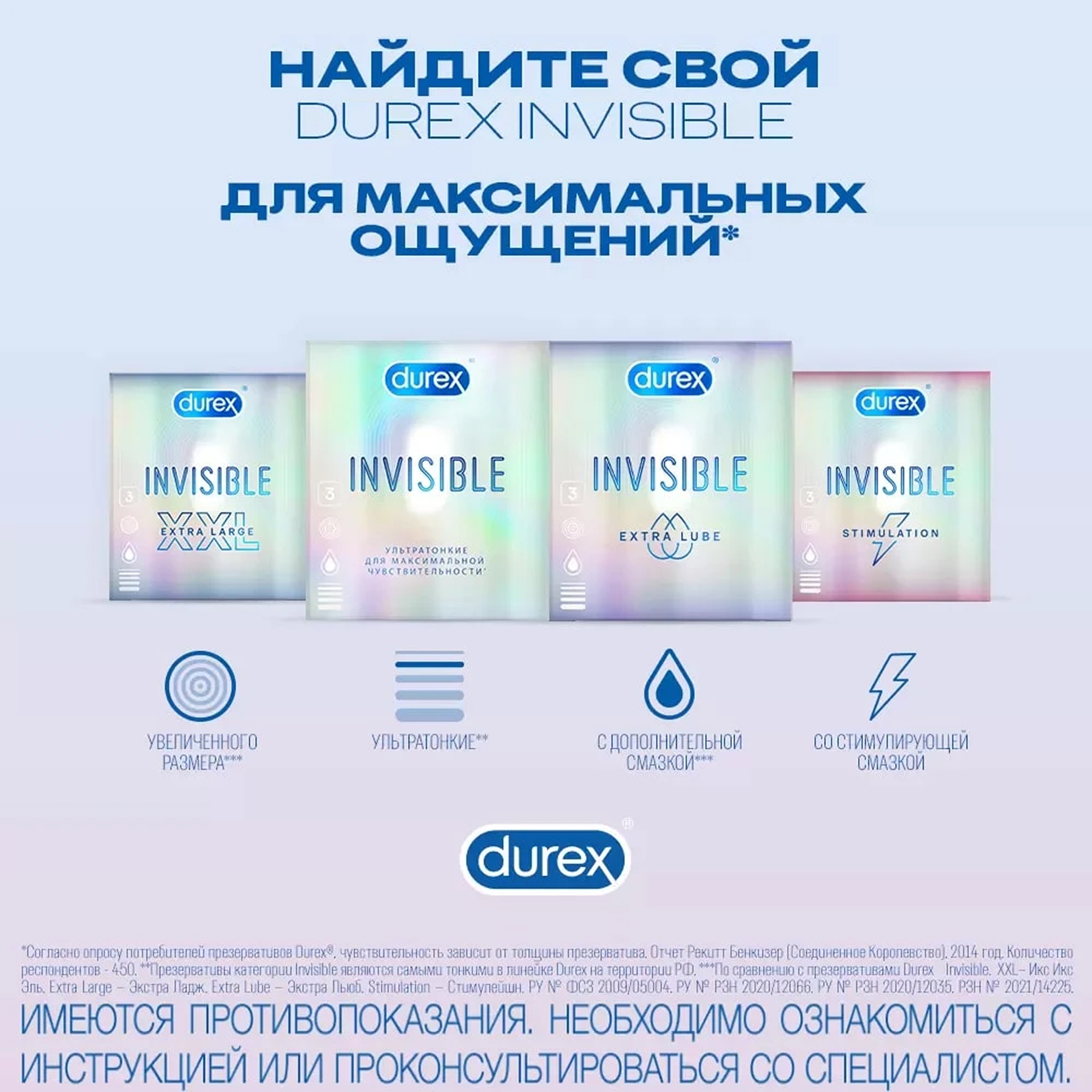 *Презервативы категории Invisible являются самыми тонкими в линейке Durex® в продаже на территории РФ. Опрос потребителей презервативов Durex® показал, что чувствительность зависит от толщины презерватива. Отчет по результатам исследования Рекитт Бенкизер (Соединенное Королевство), 2014 г., количество респондентов – 450.