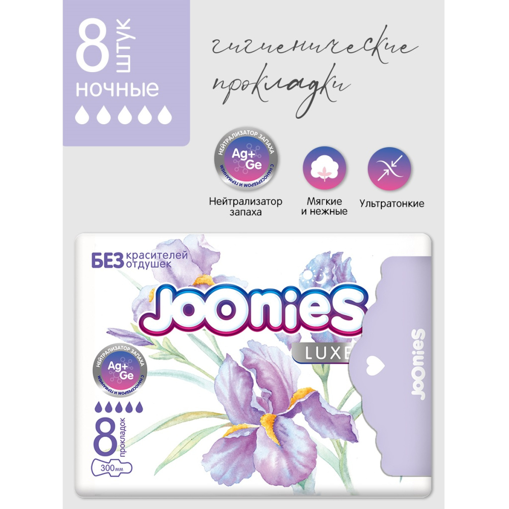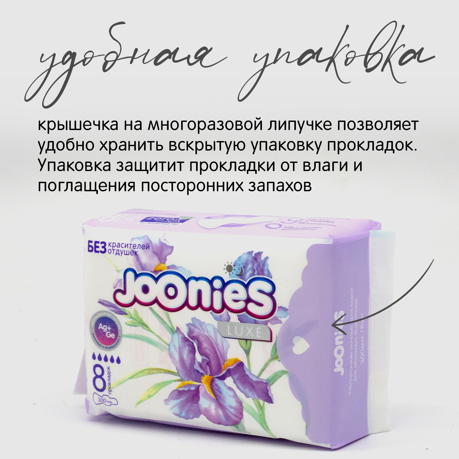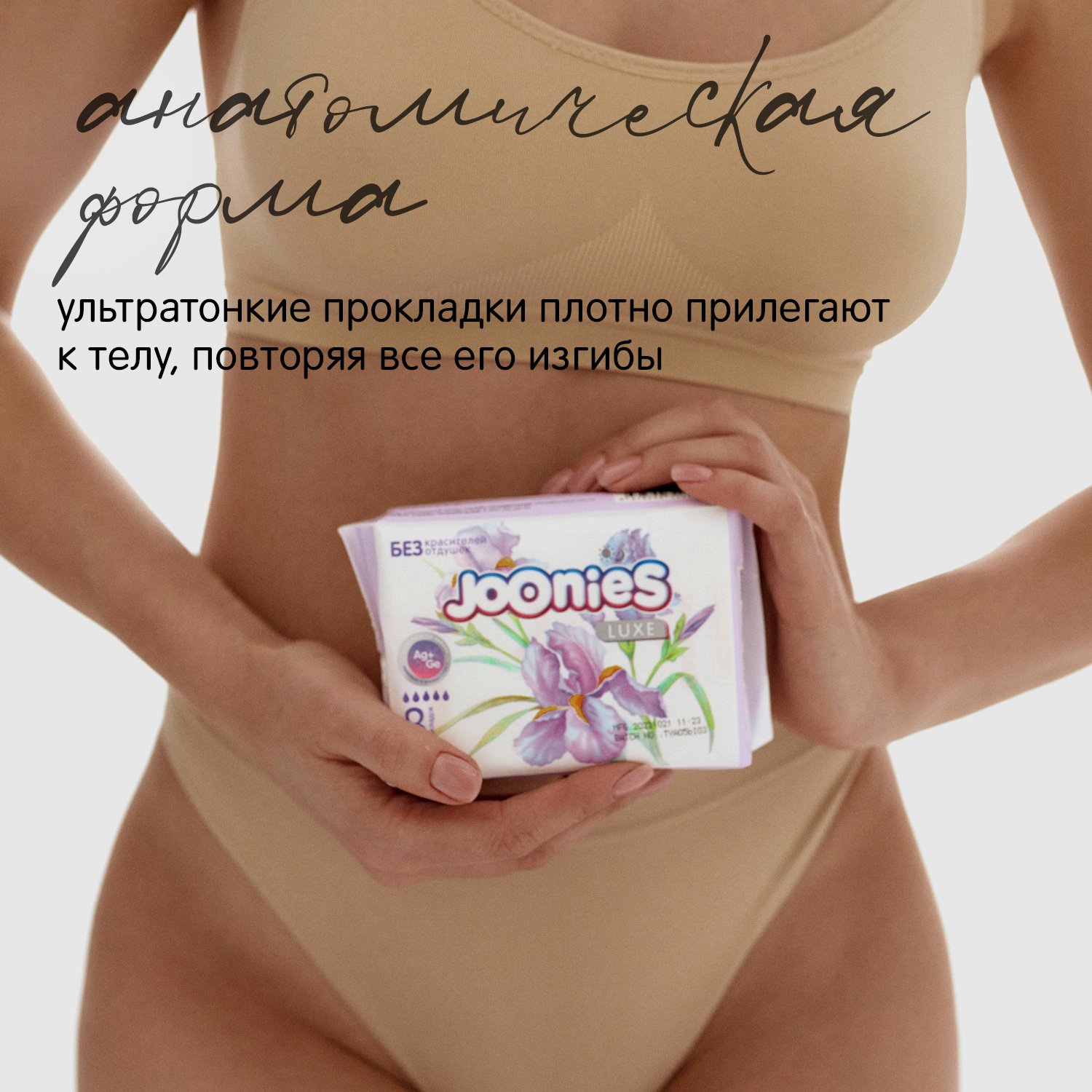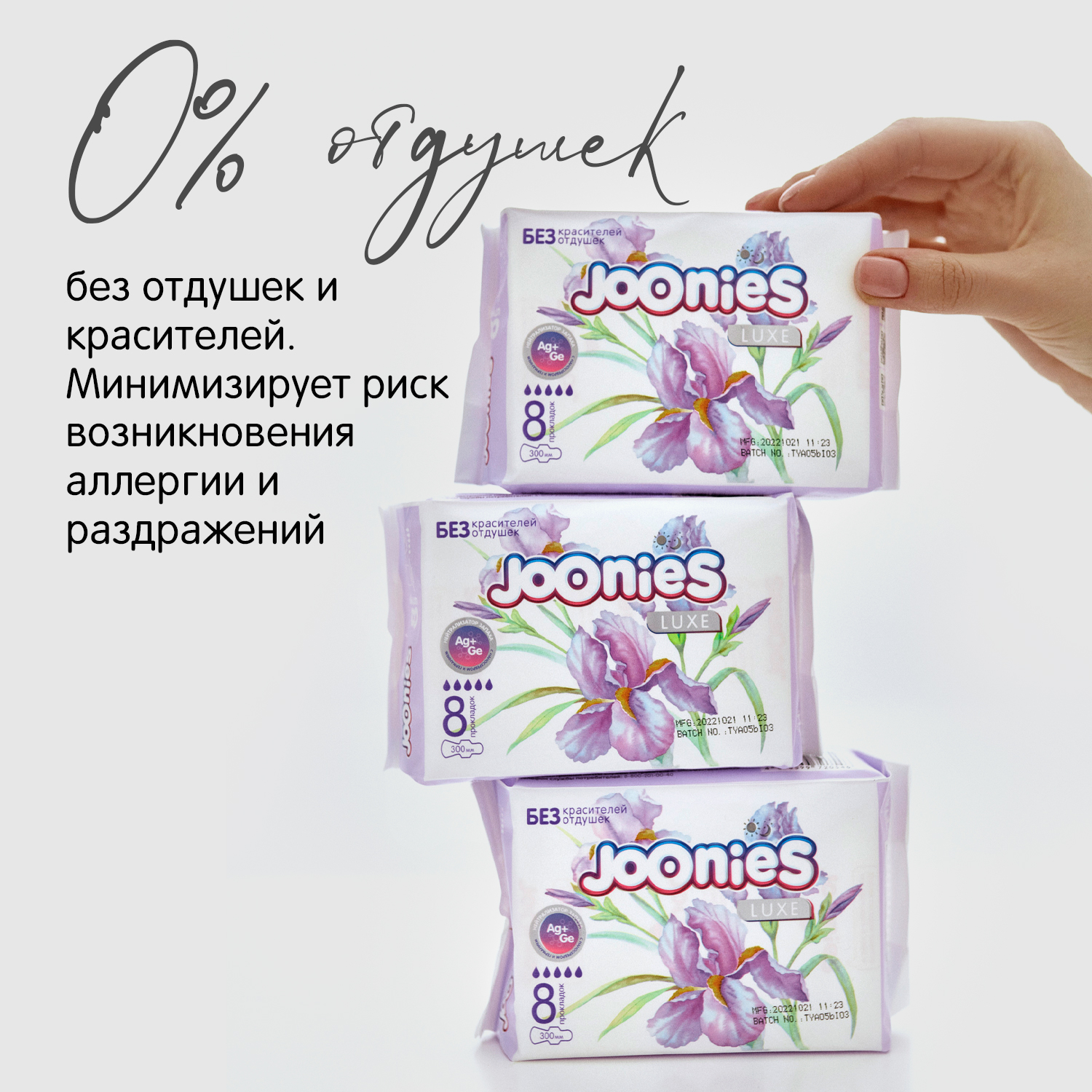 Ультратонкие прокладки JOONIES Luxe мгновенно впитывают влагу и удерживают ее внутри, обеспечивая до 100% защиты и уверенности.