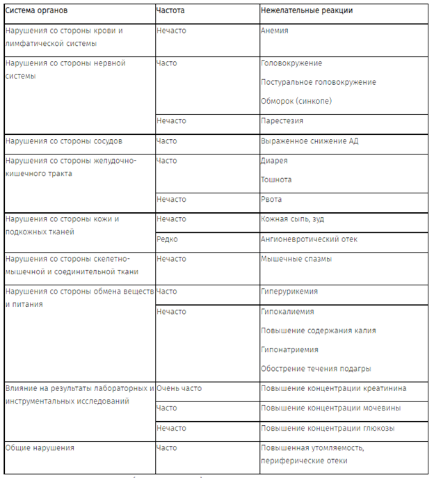 При одновременном применении азилсартана медоксомила с хлорталидоном частота нежелательных реакций - выраженное снижение АД и повышение концентрации креатинина - увеличивается по частоте встречаемости: с нечасто до часто. Это связано с более эффективным снижением АД по сравнению с монотерапией азилсартана медоксомилом. Большинство этих эффектов были кратковременными или не прогрессирующими, пока пациенты продолжали терапию. После отмены препарата большинство случаев увеличения концентрации креатинина, не проходивших во время лечения, были обратимыми.