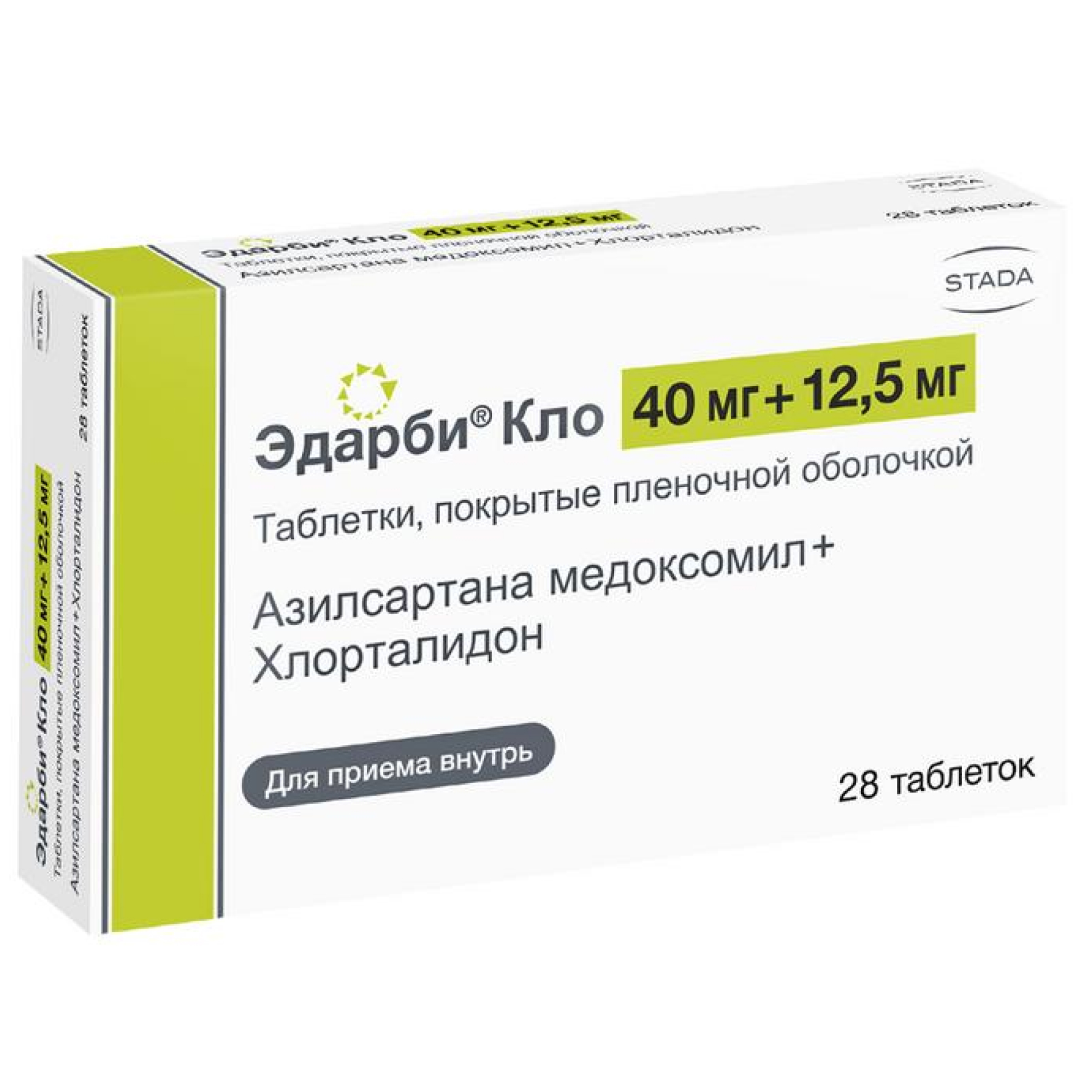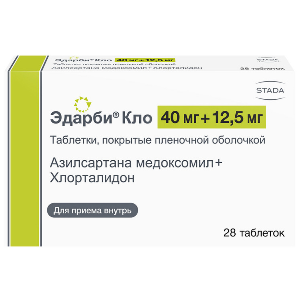 Комбинированный антигипертензивный препарат. В состав препарата Эдарби® Кло входят антагонист рецепторов ангиотензина II (азилсартана медоксомил) и тиазидоподобный диуретик (хлорталидон). Одновременное применение двух действующих веществ приводит к более выраженному снижению АД по сравнению с приемом каждого из них в монотерапии. При приеме препарата 1 раз/сут достигается эффективное снижение АД в течение 24 ч.