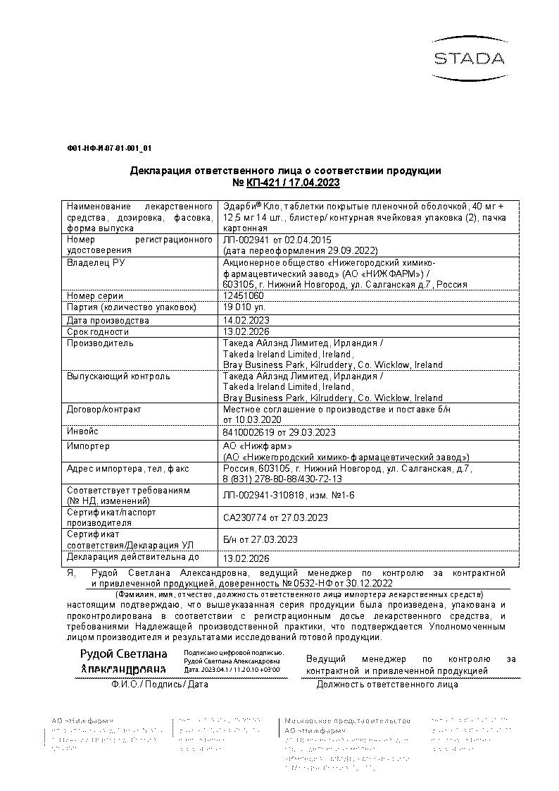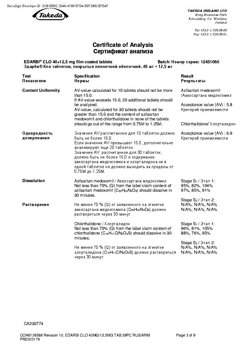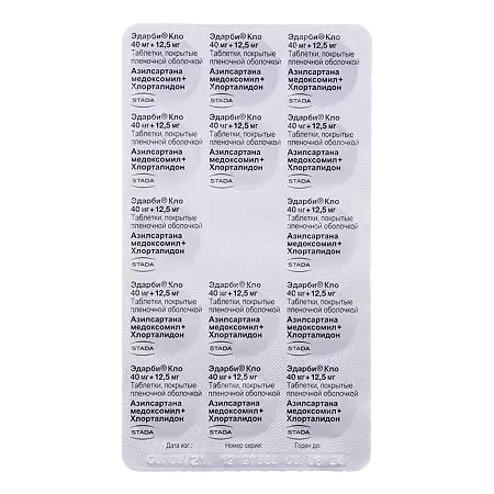 Рекомендованная начальная доза препарата Эдарби® Кло составляет 40 мг азилсартана медоксомила + 12.5 мг хлорталидона 1 раз/сут.
