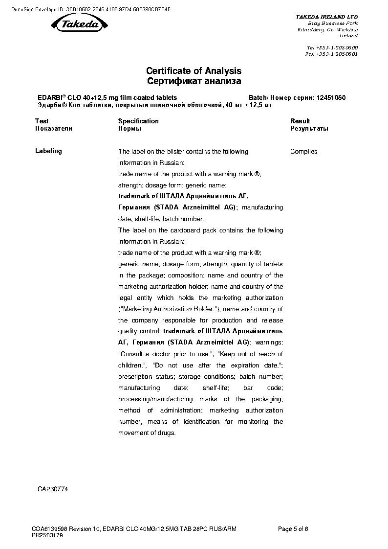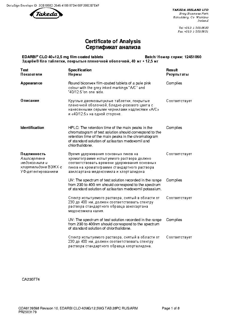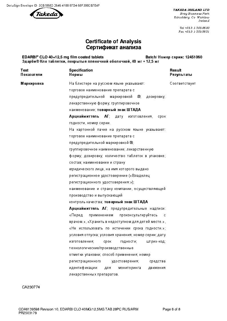 Эдарби® Кло следует принимать ежедневно, без перерыва. В случае прекращения лечения пациент должен сообщить об этом врачу.