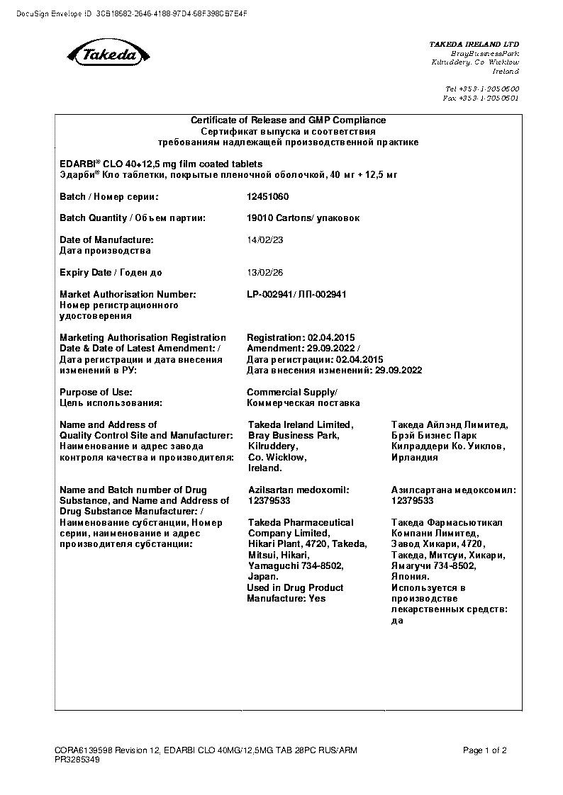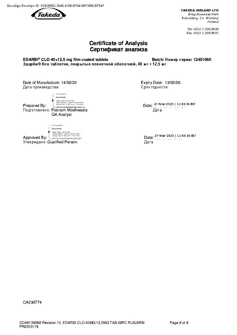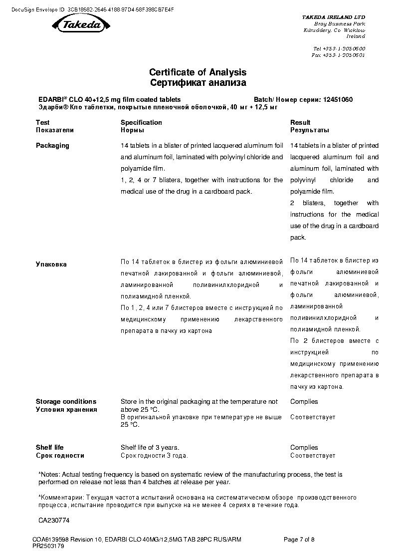 Эдарби® Кло принимают внутрь 1 раз/сут независимо от времени приема пищи.