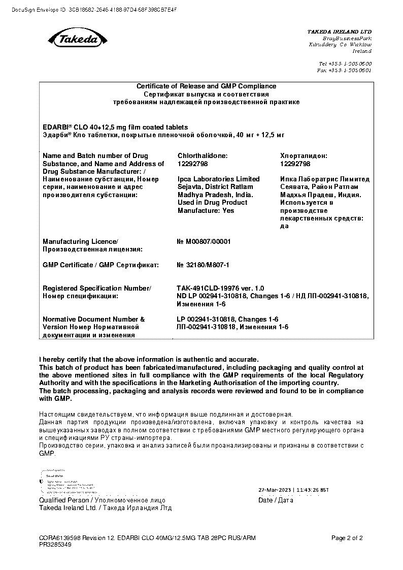 Комбинированный антигипертензивный препарат. В состав препарата Эдарби® Кло входят антагонист рецепторов ангиотензина II (азилсартана медоксомил) и тиазидоподобный диуретик (хлорталидон). Одновременное применение двух действующих веществ приводит к более выраженному снижению АД по сравнению с приемом каждого из них в монотерапии. При приеме препарата 1 раз/сут достигается эффективное снижение АД в течение 24 ч.