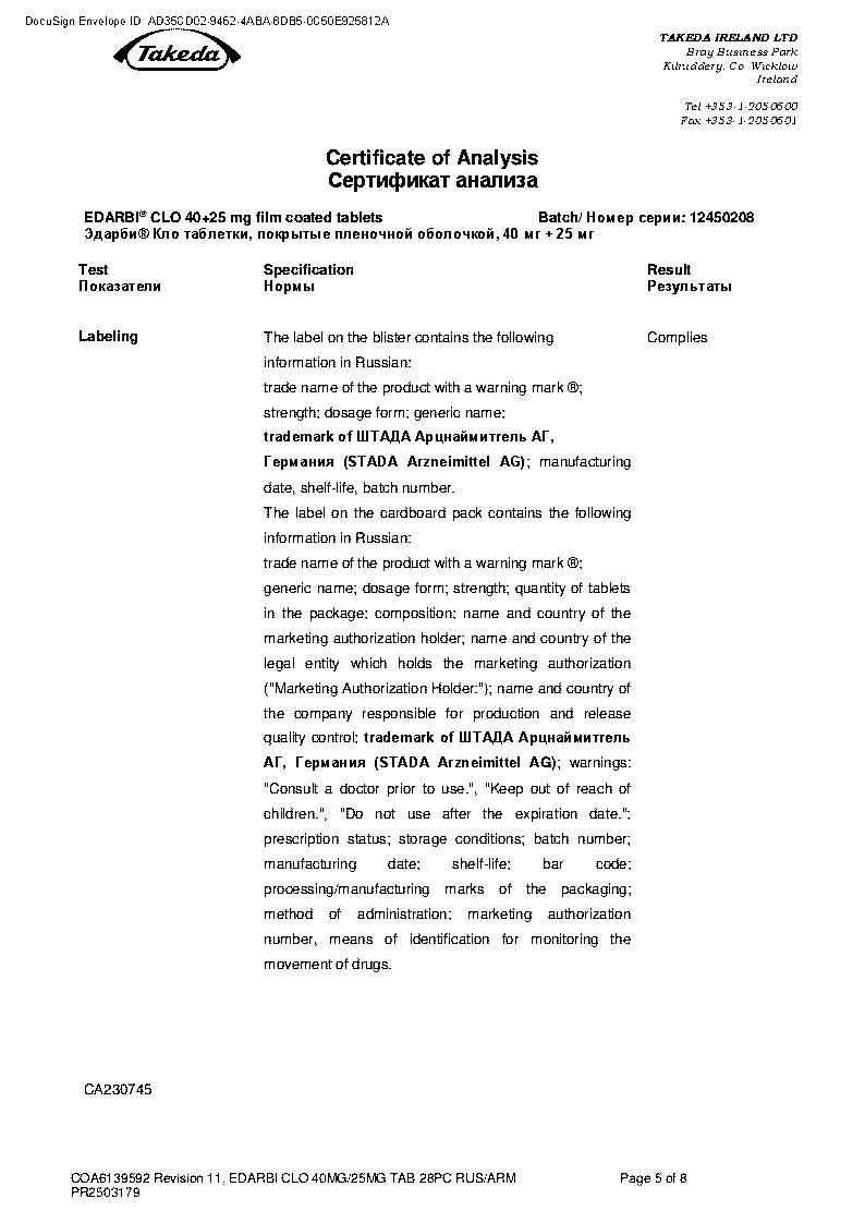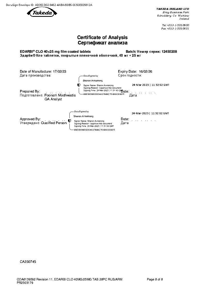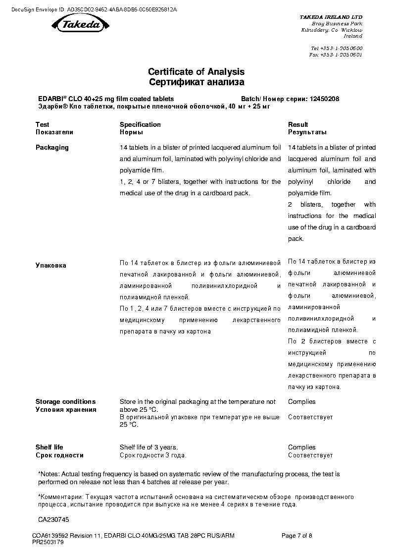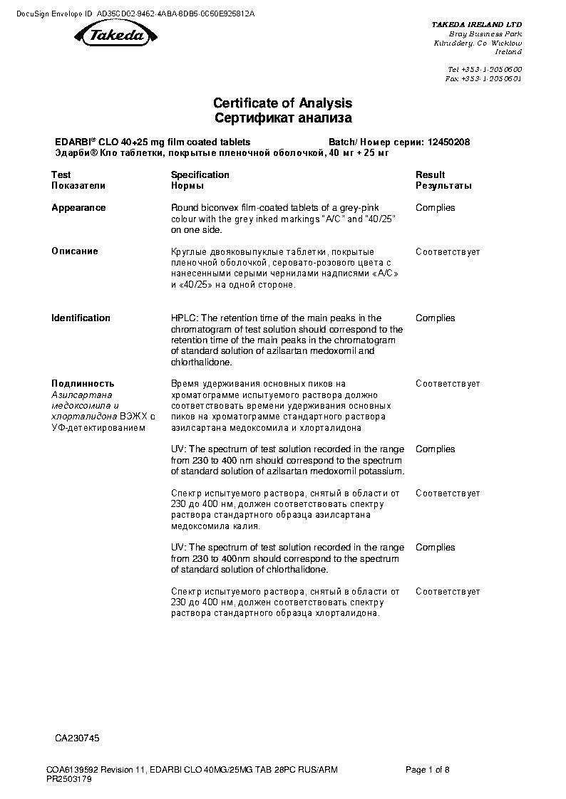 Эдарби® Кло принимают внутрь 1 раз/сут независимо от времени приема пищи.
