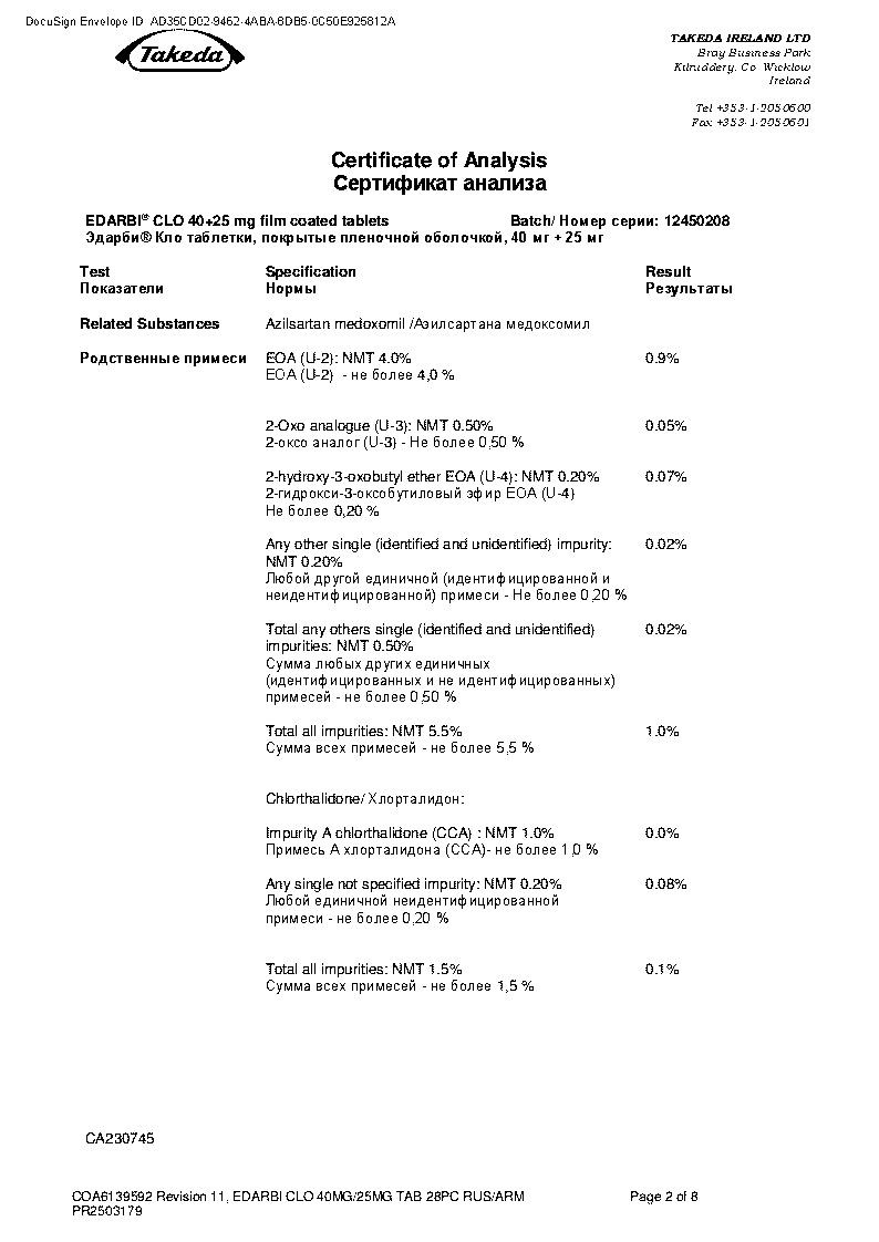 Значение AUC хлорталидона сходно как при его совместном приеме с азилсартана медоксомилом, так и без него. Однако Cmax на 47 % выше при его совместном приеме с азилсартана медоксомилом в составе препарата Эдарби® Кло. Прием пищи не оказывает клинически значимого влияния на биодоступность препарата.