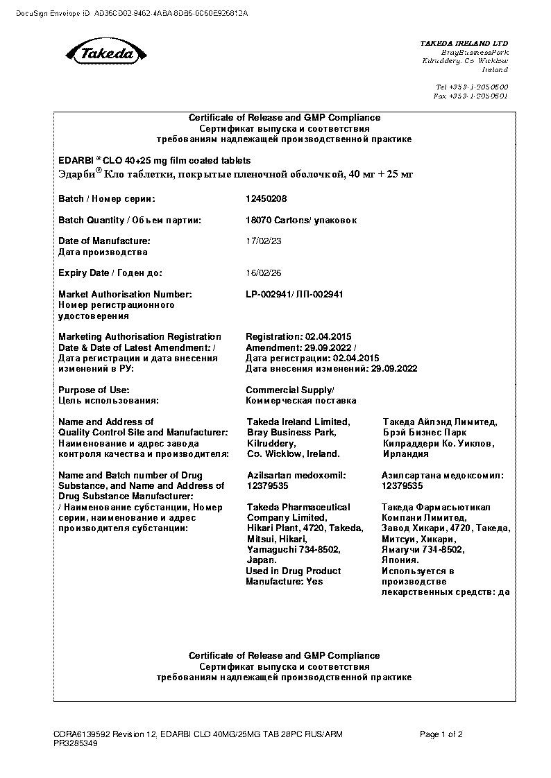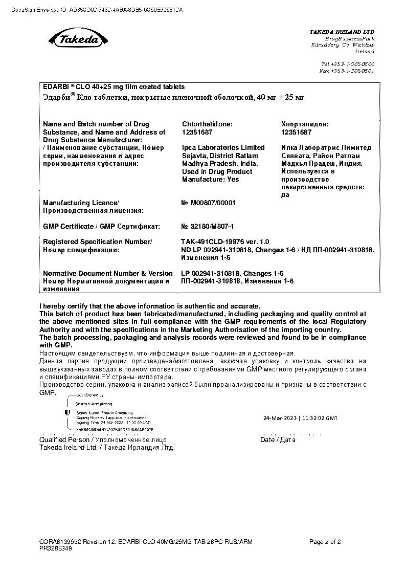 Комбинированный антигипертензивный препарат. В состав препарата Эдарби® Кло входят антагонист рецепторов ангиотензина II (азилсартана медоксомил) и тиазидоподобный диуретик (хлорталидон). Одновременное применение двух действующих веществ приводит к более выраженному снижению АД по сравнению с приемом каждого из них в монотерапии. При приеме препарата 1 раз/сут достигается эффективное снижение АД в течение 24 ч.