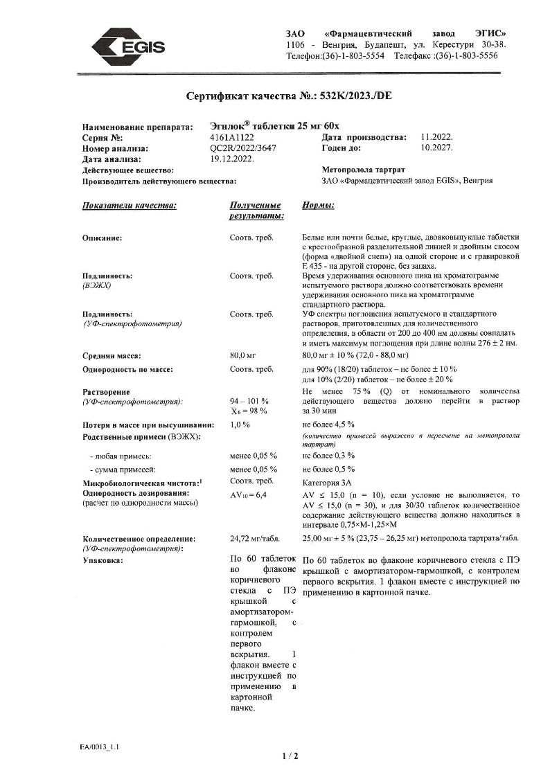 Эгилок® таблетки принимают внутрь. Таблетки можно принимать с пищей или вне зависимости от приема пищи. При необходимости таблетку можно разломить пополам.