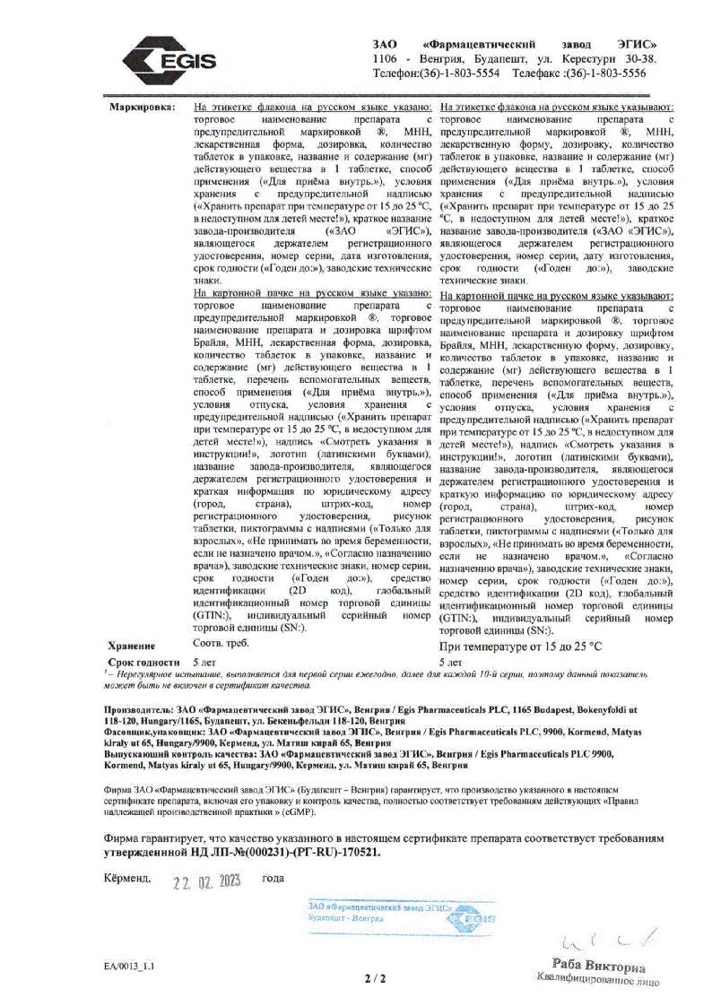 Вспомогательные вещества: целлюлоза микрокристаллическая - 41.5 мг, карбоксиметилкрахмал натрия (тип А) - 7.5 мг, кремния диоксид коллоидный безводный - 2 мг, повидон К90 - 2 мг, магния стеарат - 2 мг.