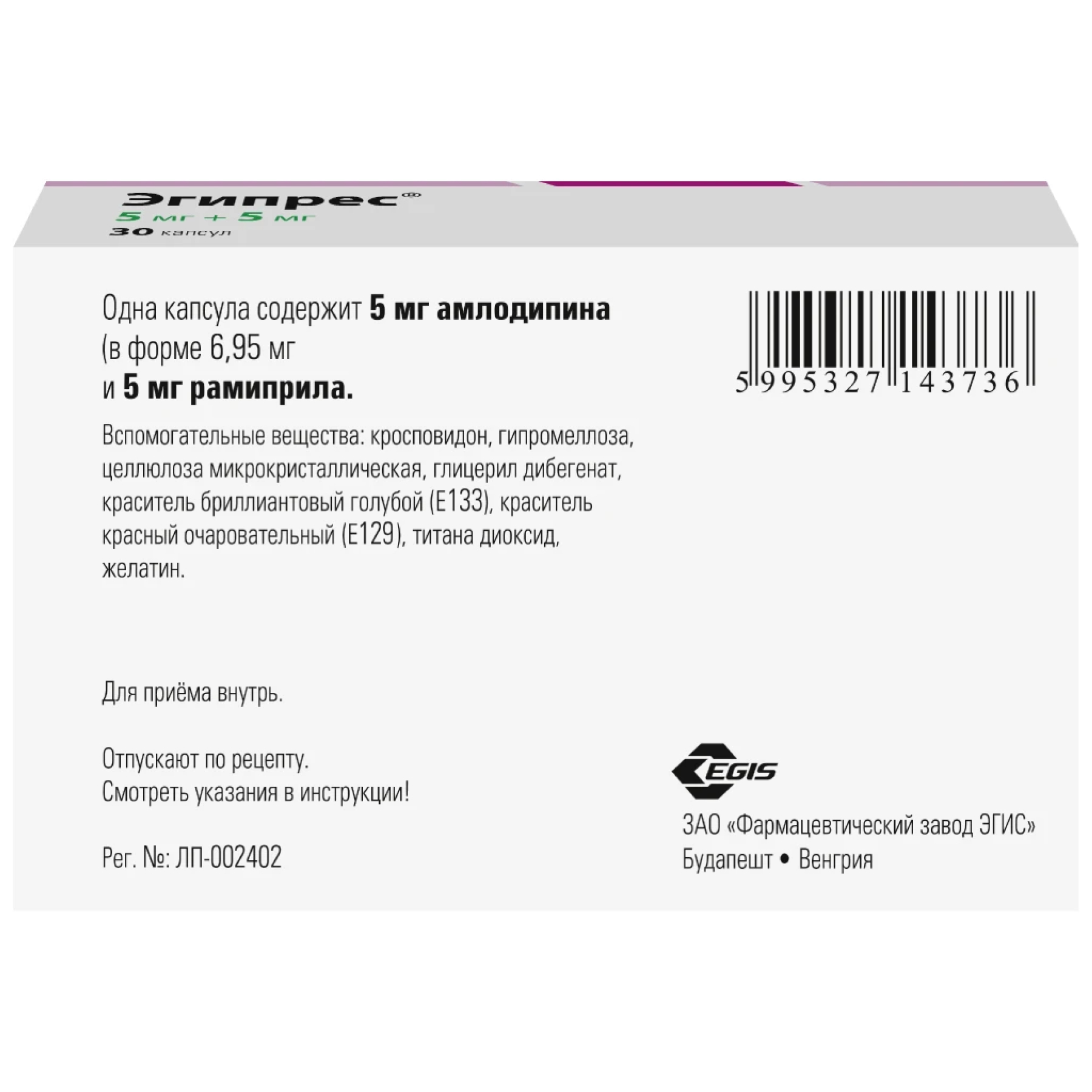При терапевтической необходимости доза препарата Эгипрес® может быть изменена на основании индивидуального титрования доз отдельных компонентов: 5 мг амлодипина + 5 мг рамиприла или 5 мг амлодипина + 10 мг рамиприла или 10 мг амлодипина + 5 мг рамиприла или 10 мг амлодипина + 10 мг рамиприла.