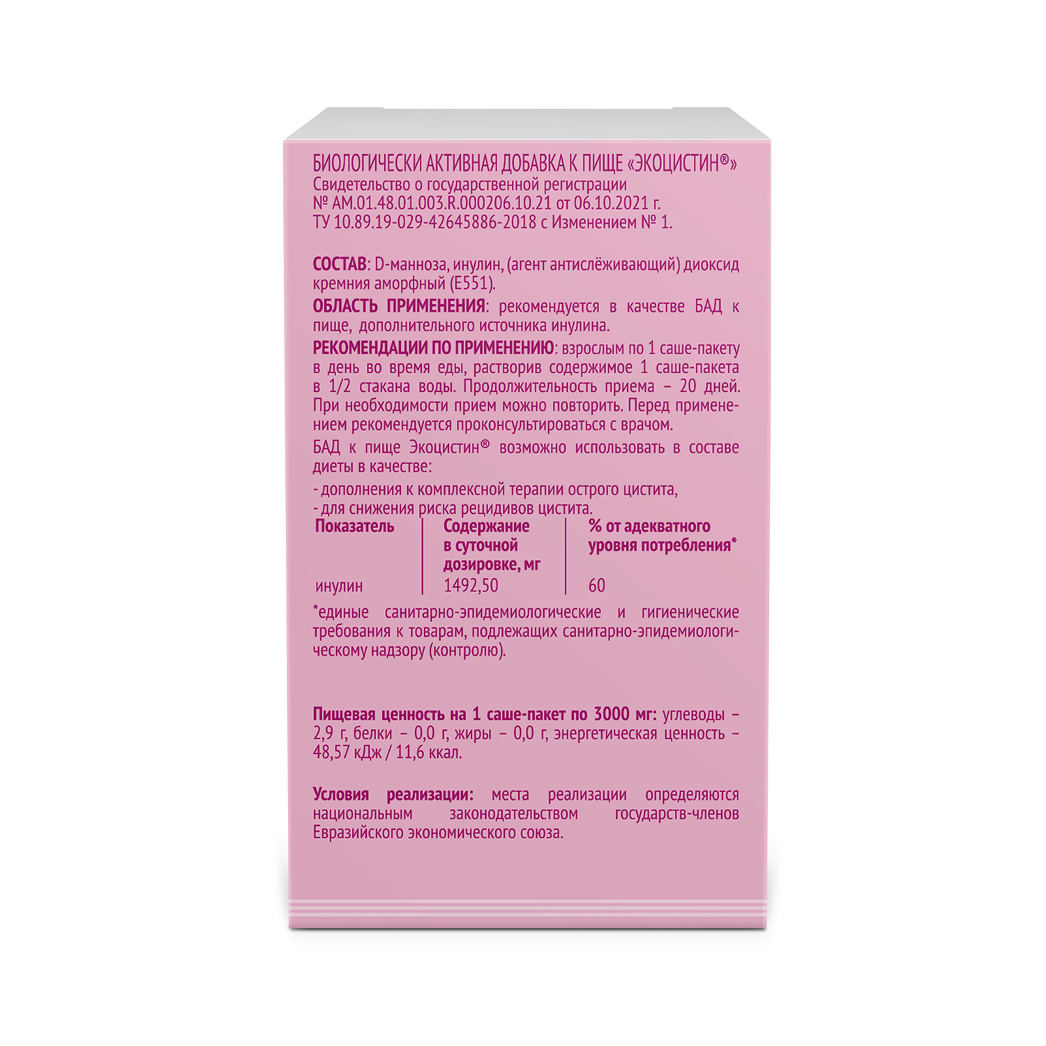 Область применения: рекомендуется в качестве БАД к пище - источника инулина.