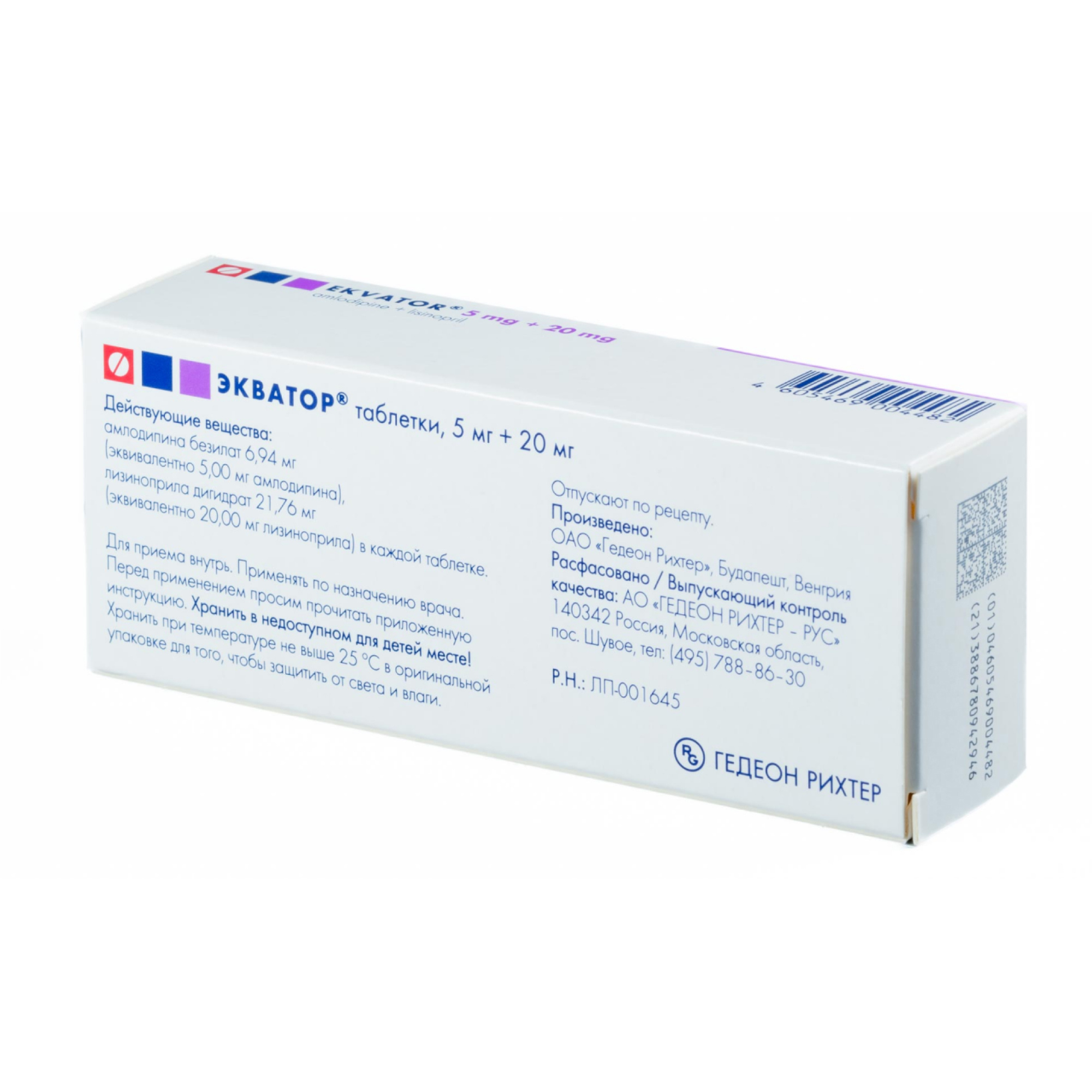 для препарата Экватор® таблетки 5 мг + 20 мг - 5 мг амлодипина и 20 мг лизиноприла,