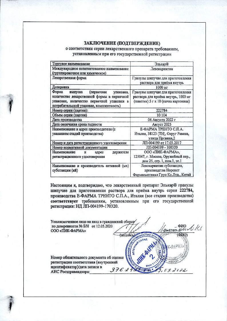 При заболеваниях, сопровождающихся недостатком карнитина или его повышенной потерей (миопатии, кардиомиопатии, митохондриальные заболевания, наследственные заболевания с сопутствующей митохондриальной недостаточностью): до 50-100 мг/кг массы тела с кратностью приёма 2-3 раза в день до 7 г (7 пакетиков) в сутки. Курс лечения - в течение 3-1 мес.