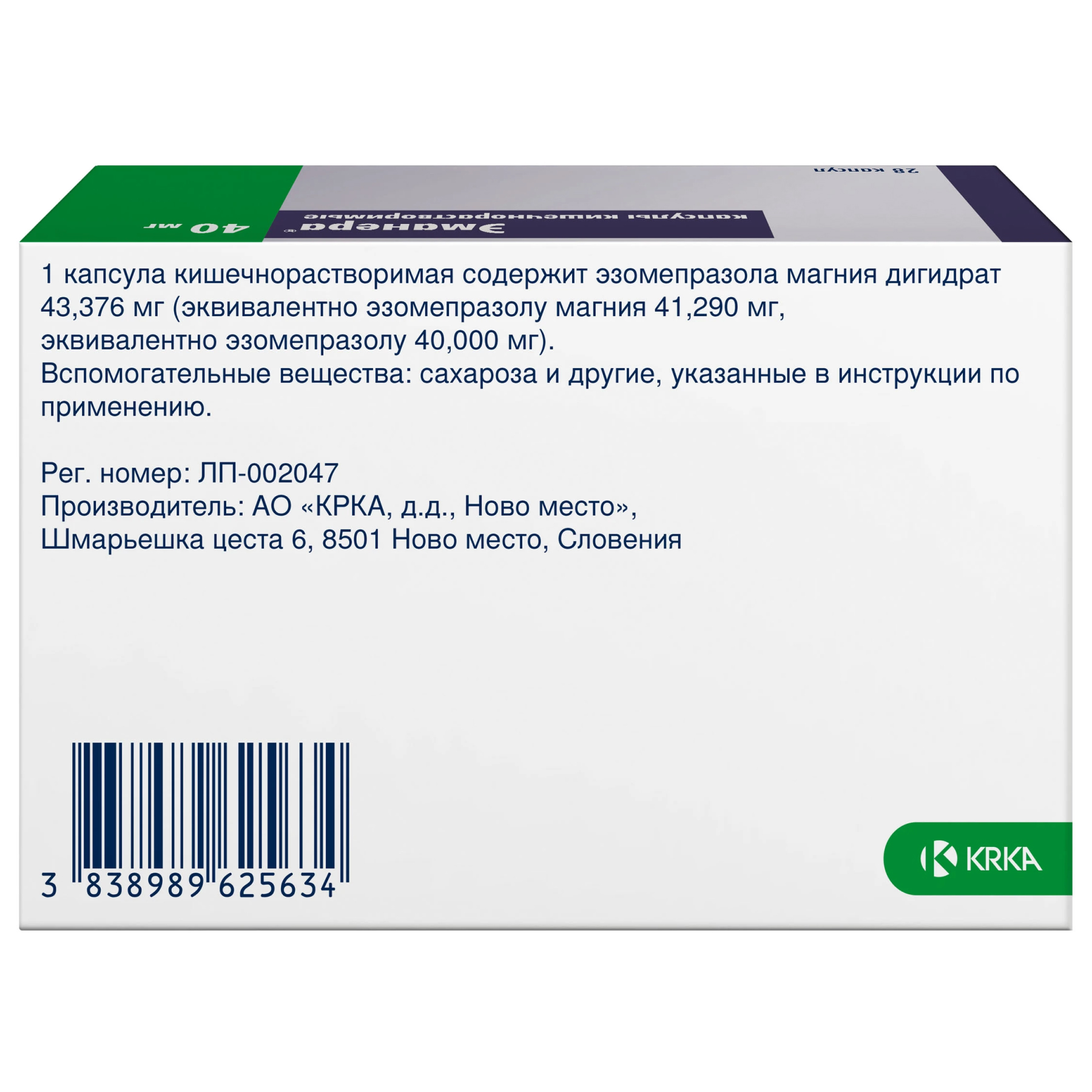 Активное вещество: эзомепразол магния 41.29 мг, что соответствует содержанию эзомепразола 40 мг.