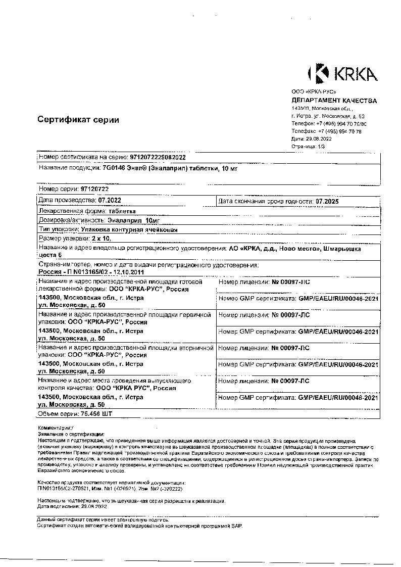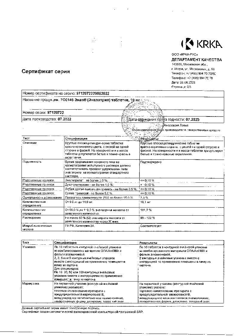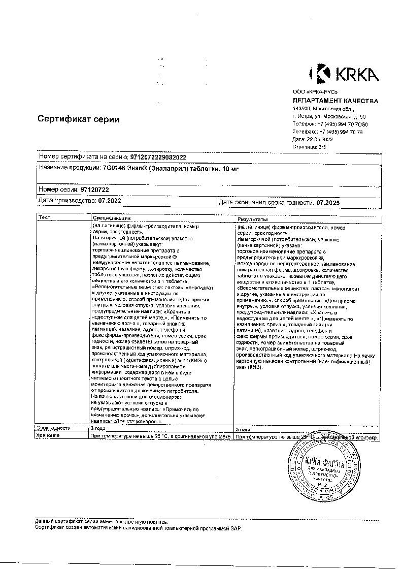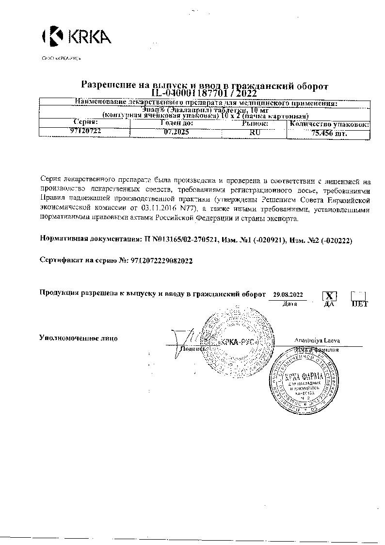 При приеме внутрь около 60% абсорбируется из ЖКТ. Одновременный прием пищи не влияет на всасывание. Метаболизируется в печени путем гидролиза с образованием эналаприлата, благодаря фармакологической активности которого реализуется гипотензивное действие. Связывание эналаприлата с белками плазмы составляет 50-60%.