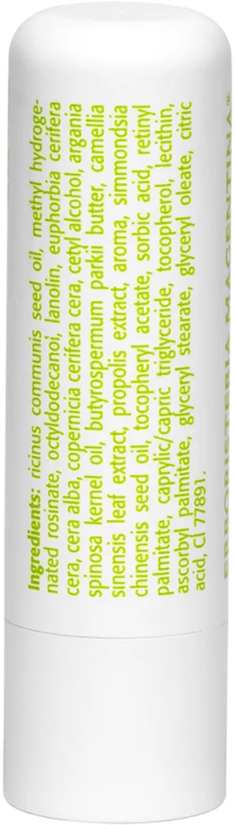 RUCINUS COMMUNIS SEED OIL, METHYL HYDROGENATED ROSINATE, OCTYLDODECANOL, LANOLIN, EUPHORBIA CERIFERA CERA, CERA ALBA, COPERNICIA CERIFERA CERA, CETYL ALCOHOL, AROMA, BUTYROSPERMUM PARKII BUTTER, CAMELLIA SINENSIS LEAF EXTRACT, PROPOLIS EXTRACT, SORBIC ACID, ARGANIA SPINOSA KERNEL OIL, SIMMONDSIA CHINENSIS SEED OIL, TOCOPHERYL ACETATE, RETINYL PALMITATE, CAPRYLIC/CAPRIC TRIGLYCERIDE, TOCOPHEROL, LECITHIN, ASCORBYL PALMITATE, GLYCERYL STEARATE, GLYCERYL OLEATE, CITRIC ACID, CI 77891 (TITANIUM DIOXIDE).