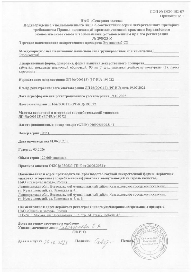Дети. Фармакокинетические параметры эторикоксиба у детей в возрасте до 12 лет не изучались. В фармакокинетическом исследовании (n=16), проводившемся у подростков в возрасте от 12 до 17 лет, фармакокинетика у подростков с массой тела от 40 до 60 кг при приеме эторикоксиба в дозе 60 мг 1 раз/сут и у подростков с массой тела более 60 кг при приеме эторикоксиба в дозе 90 мг 1 раз/сут была аналогична фармакокинетике у взрослых при приеме эторикоксиба в дозе 90 мг 1 раз/сут. Безопасность и эффективность эторикоксиба у детей не установлена.