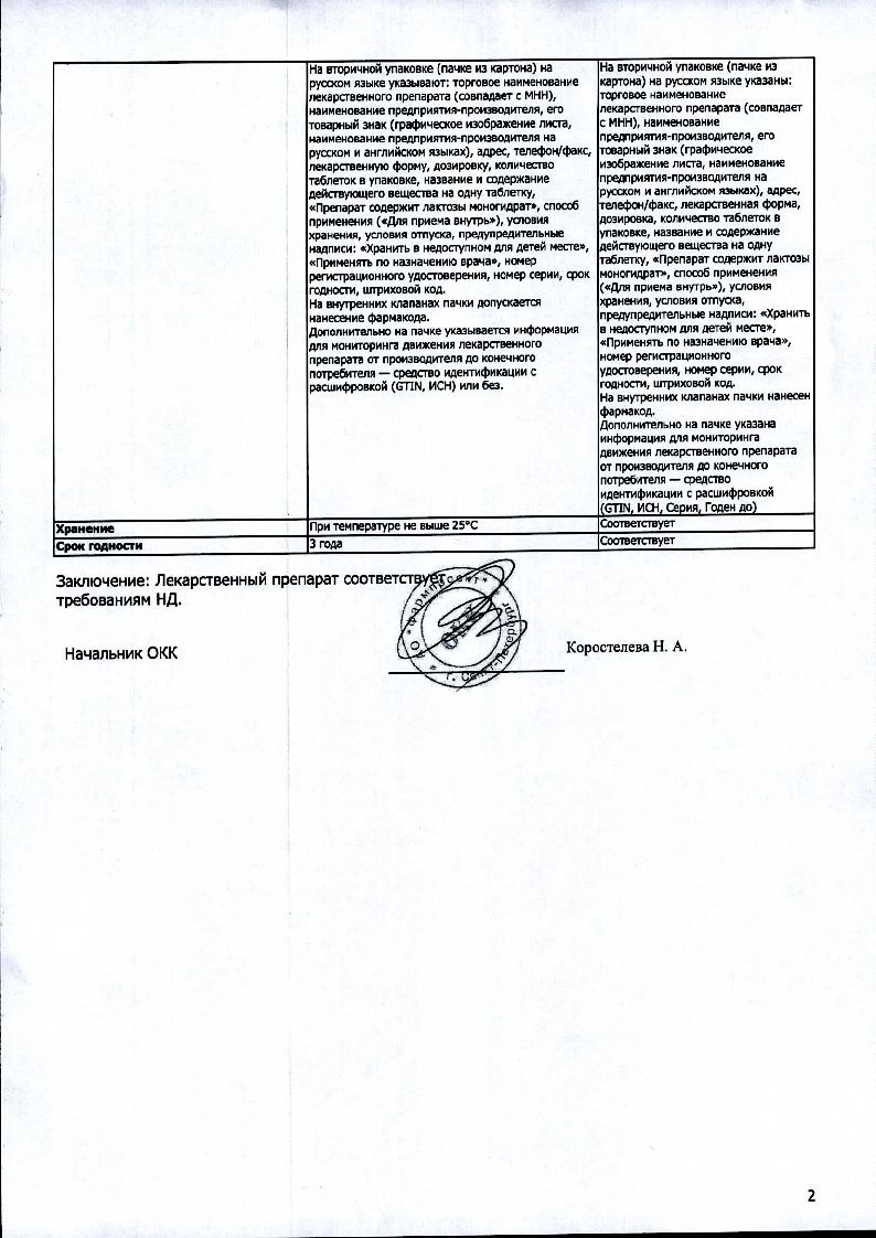 Вспомогательные вещества: целлюлоза микрокристаллическая (тип 102), кальция гидрофосфат безводный, кроскармеллоза натрия, повидон К 30, магния стеарат.