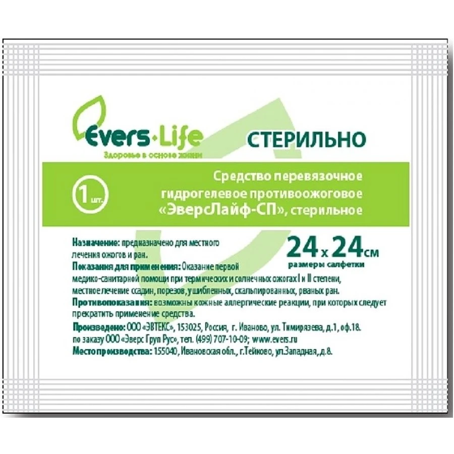«ЭверсЛайф-СП» представляет собой биологически активный низковязкий гидрогель на основе хитозан-желатинового полиэлектролитного комлекса с иммобилизованными фармсубстанциями декспантенола, лидокаина и хлоргесидина, нанесенный на салфетку из нетканого полотна размером 18х13 см.