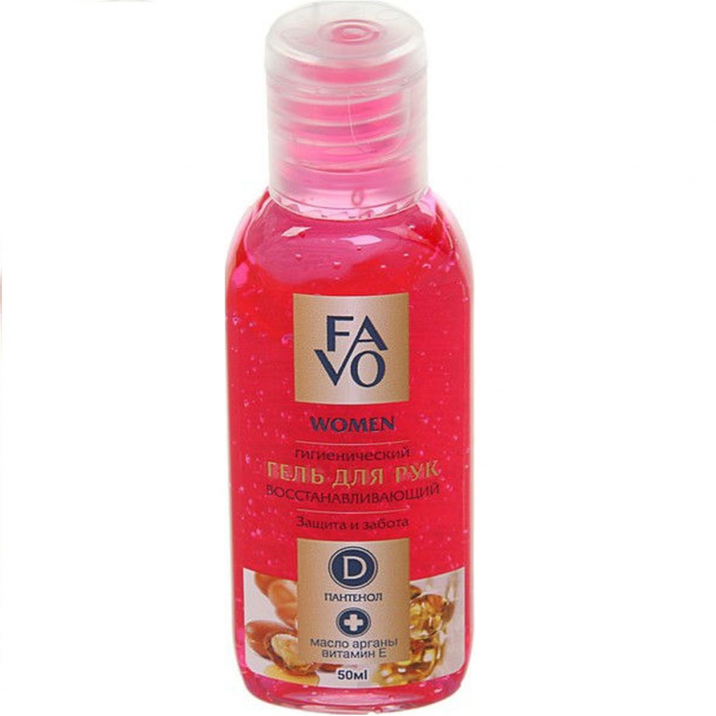 Гигиенический гель для рук FAVO с маслом арганы и витамином Е ДЛЯ НЕЕ - Гелеобразная текстура розового цвета, с освежающим запахом.