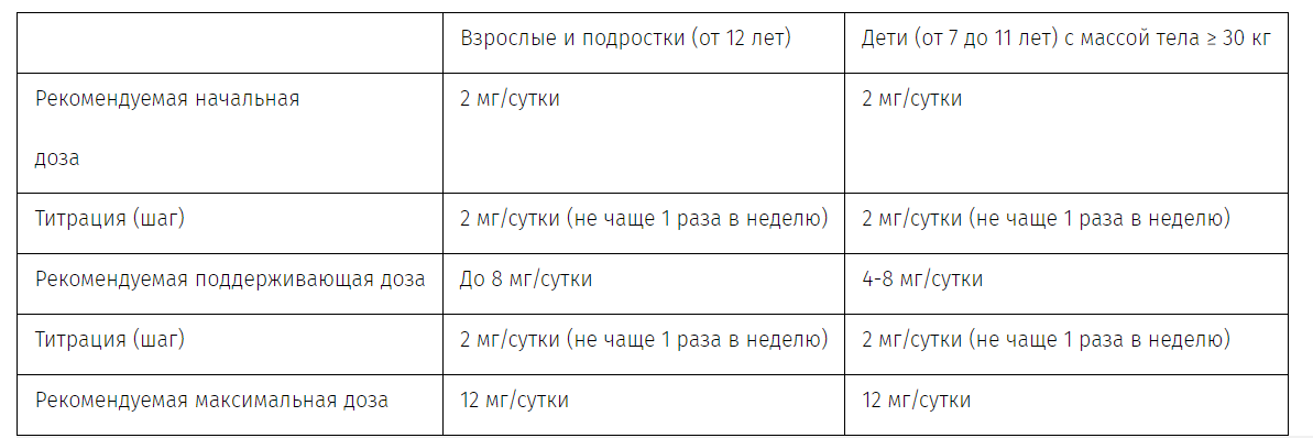 Прием препарата следует начинать с дозы 2 мг/сутки. Доза может быть увеличена в зависимости от клинического ответа и переносимости с шагом 2 мг (один раз в неделю либо один раз в две недели с учетом периода полувыведения препарата) до поддерживающей дозы до 8 мг/сутки. В зависимости от индивидуального клинического ответа и переносимости препарата в дозе 8 мг/сутки, возможно дальнейшее повышение дозы до 12 мг/сутки, которая может быть эффективна у некоторых пациентов.