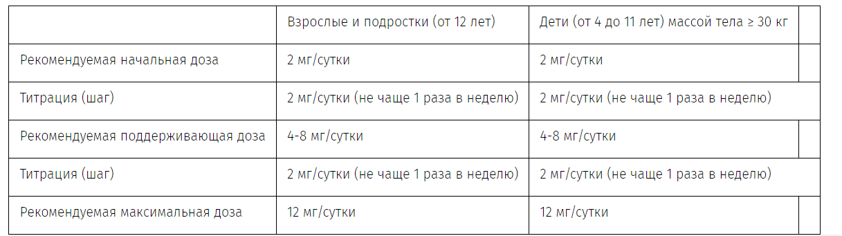 Прием препарата следует начинать с дозы 2 мг/сутки. Доза может быть увеличена в зависимости от клинического ответа и переносимости с шагом 2 мг (один раз в неделю либо один раз в две недели с учетом периода полувыведения препарата) до поддерживающей дозы от 4 до 8 мг/сутки. В зависимости от индивидуального клинического ответа и переносимости препарата в дозе 8 мг/сутки, возможно дальнейшее повышение дозы до 12 мг/сутки с шагом 2 мг.