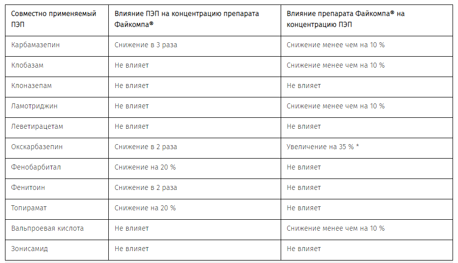 Потенциальное взаимодействие перампанела и других противоэпилептических препаратов (ПЭП) было оценено на основе данных клинических исследований. Популяционный фармакокинетический анализ сводных данных трех исследований III фазы у взрослых и подростков с парциальными приступами позволили дать оценку действия препарата Файкомпа® (при однократном приеме суточной дозы до 12 мг) на фармакокинетику других ПЭП. В другом популяционном фармакокинетическом анализ сводных данных из двадцати исследований фазы I на здоровых добровольцах при приеме препарата Файкомпа® в дозе до 36 мг, а также одного исследования фазы II и шести - фазы III у детей, подростков и взрослых пациентов с парциальными или первично-генерализованными тонико-клоническими приступами при приеме препарата Файкомпа® в однократной суточной дозе до 16 мг, оценивали влияние сопутствующих ПЭП на клиренс перампанела. Эффект данного взаимодействия на равновесные концентрации приведен в таблице: